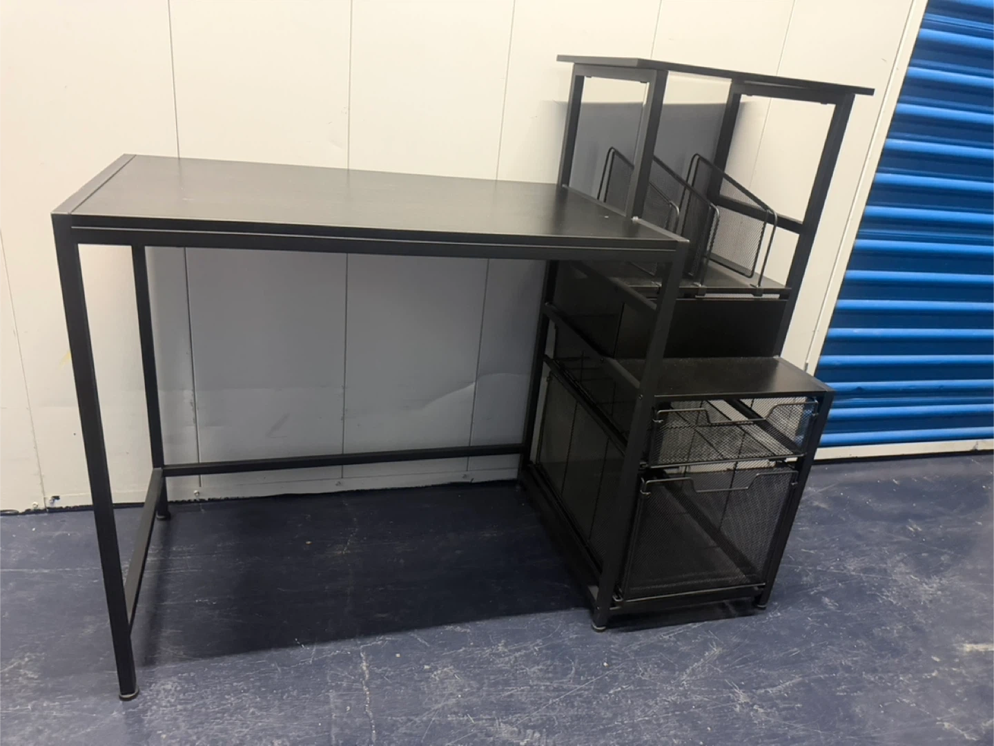 Black Metal Desk with Storage Shelves and Bins