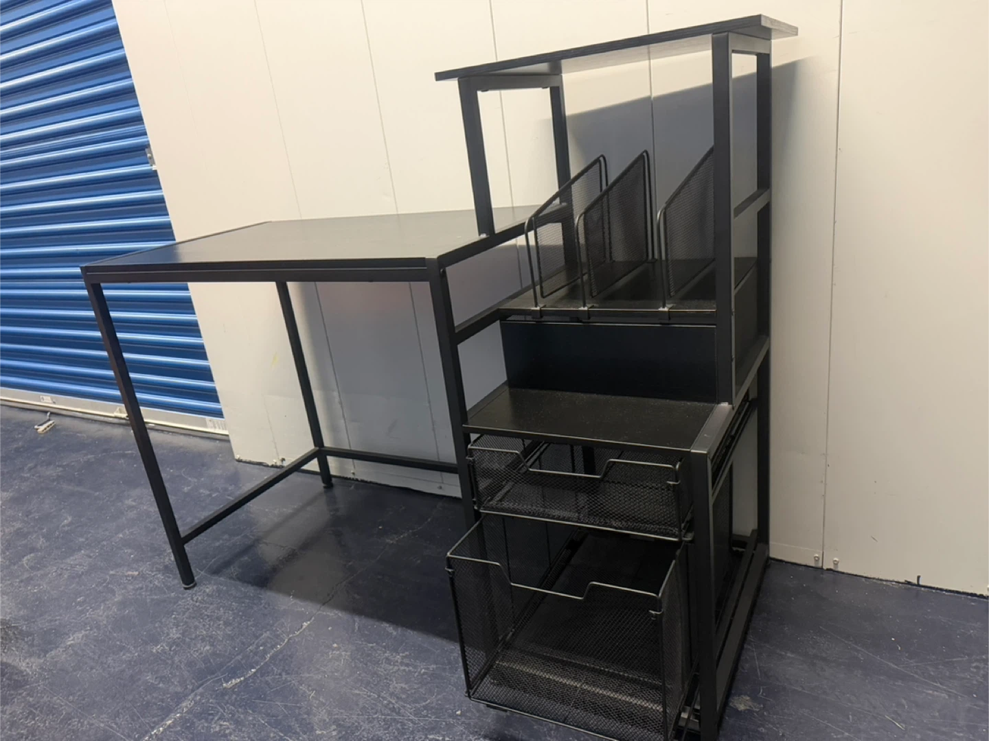 Black Metal Desk with Storage Shelves and Bins