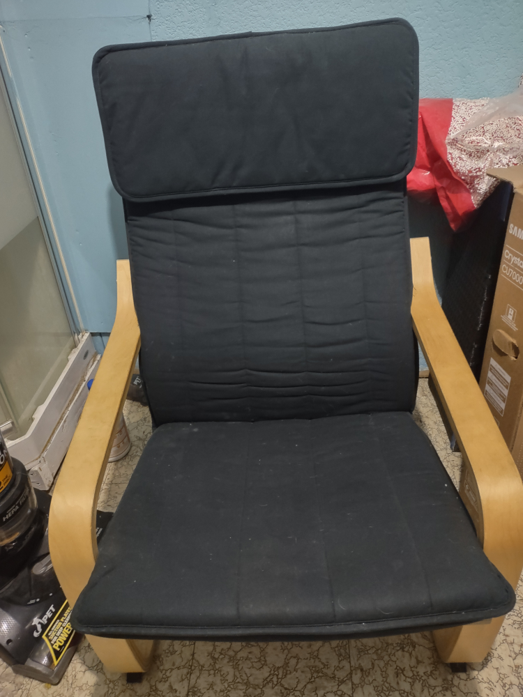 Selling a gently used IKEA Poang chair. This chair features a comfortable black cushion and a sturdy wooden frame. It's perfect for relaxing in any room of your home!
