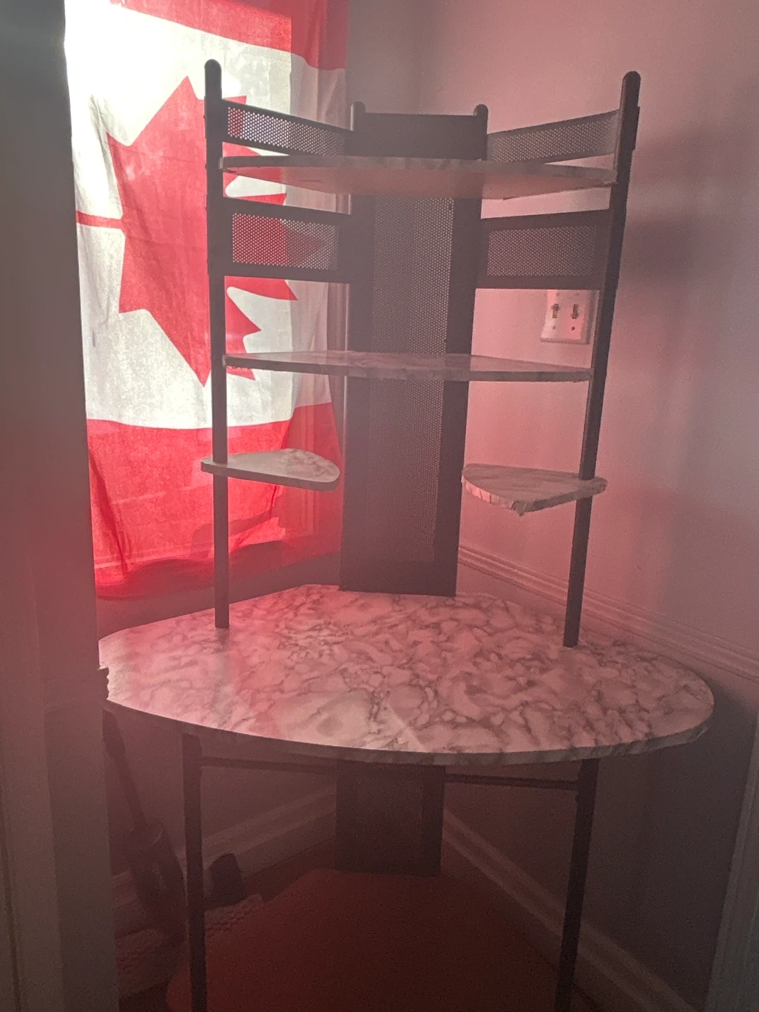 This shelving unit has a unique corner design with multiple shelves. It features a marble-patterned top surface and dark metal framing. It's great for displaying plants or decor in a tight space!