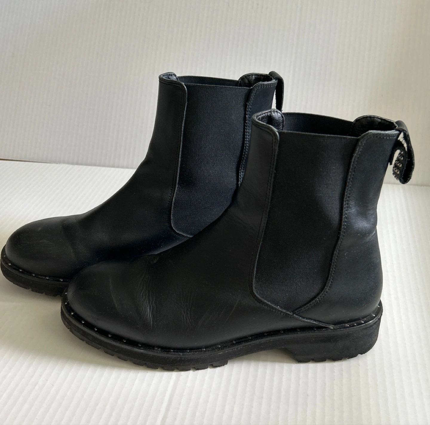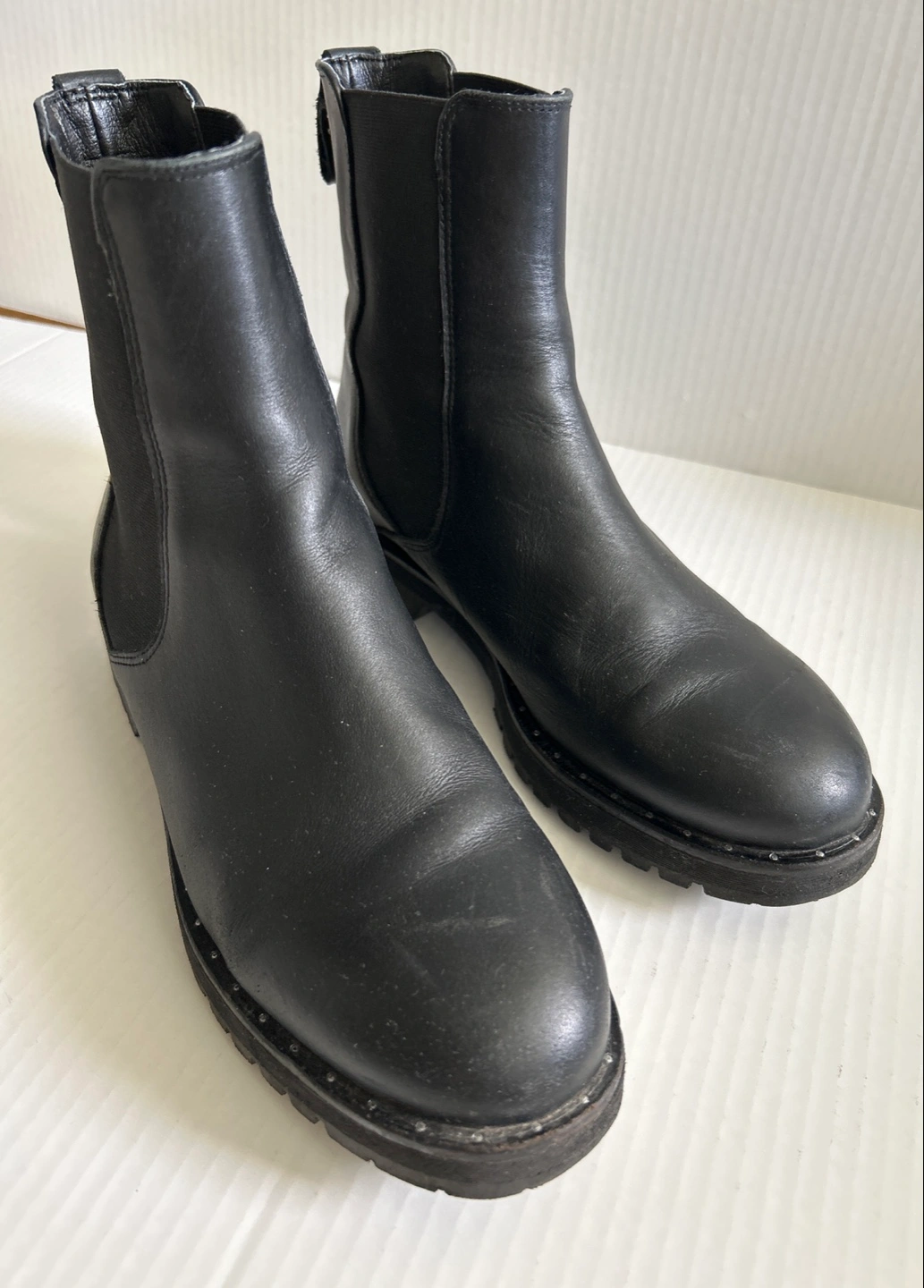 Selling a pair of Women’s black leather Chelsea boots. They're in okay condition and have some stylish stud detailing on the back. Please check out the photos provided.