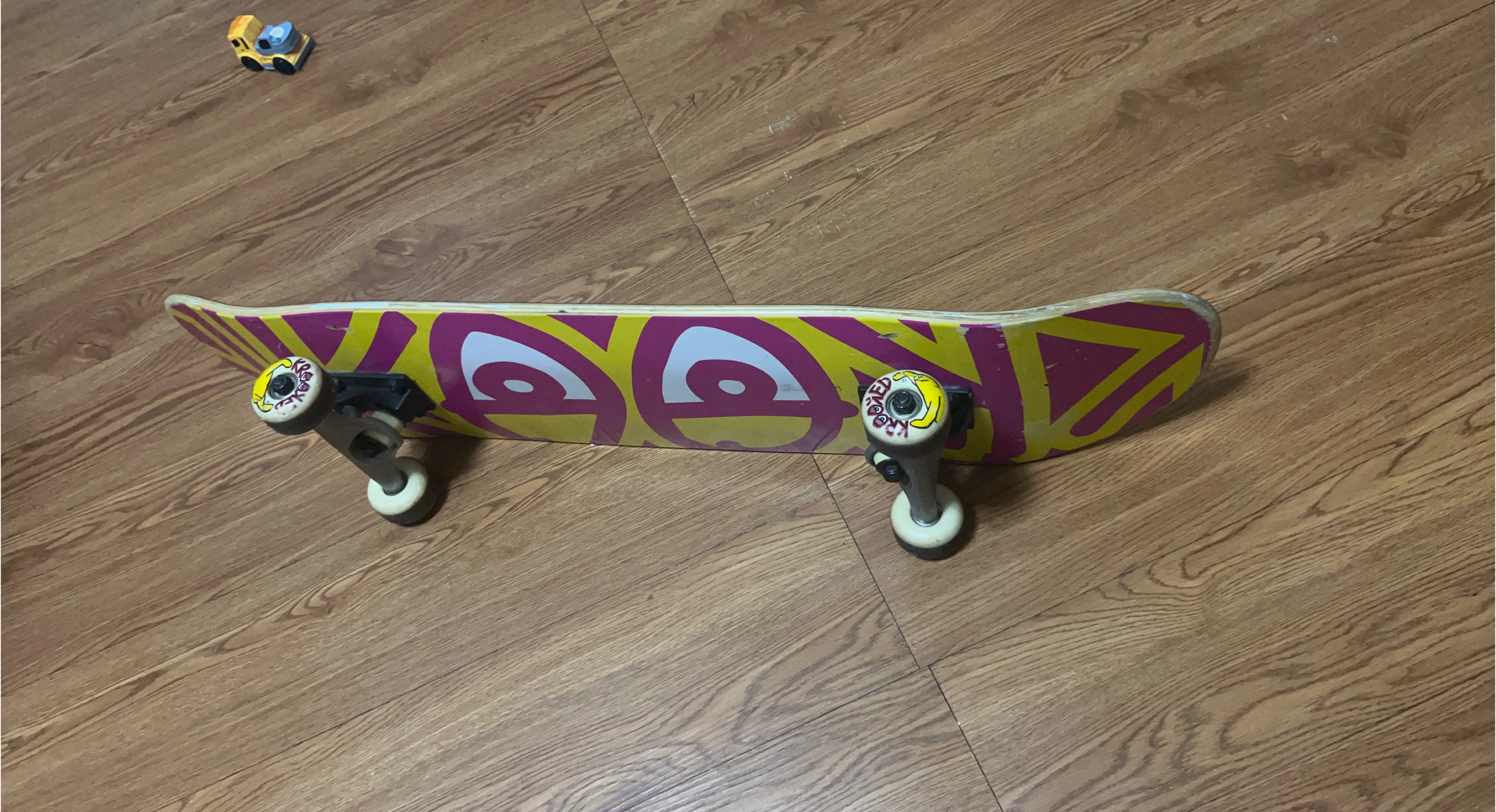 This skateboard features a vibrant yellow and pink eye graphic design. It has four white wheels and black trucks. It's ready for cruising!