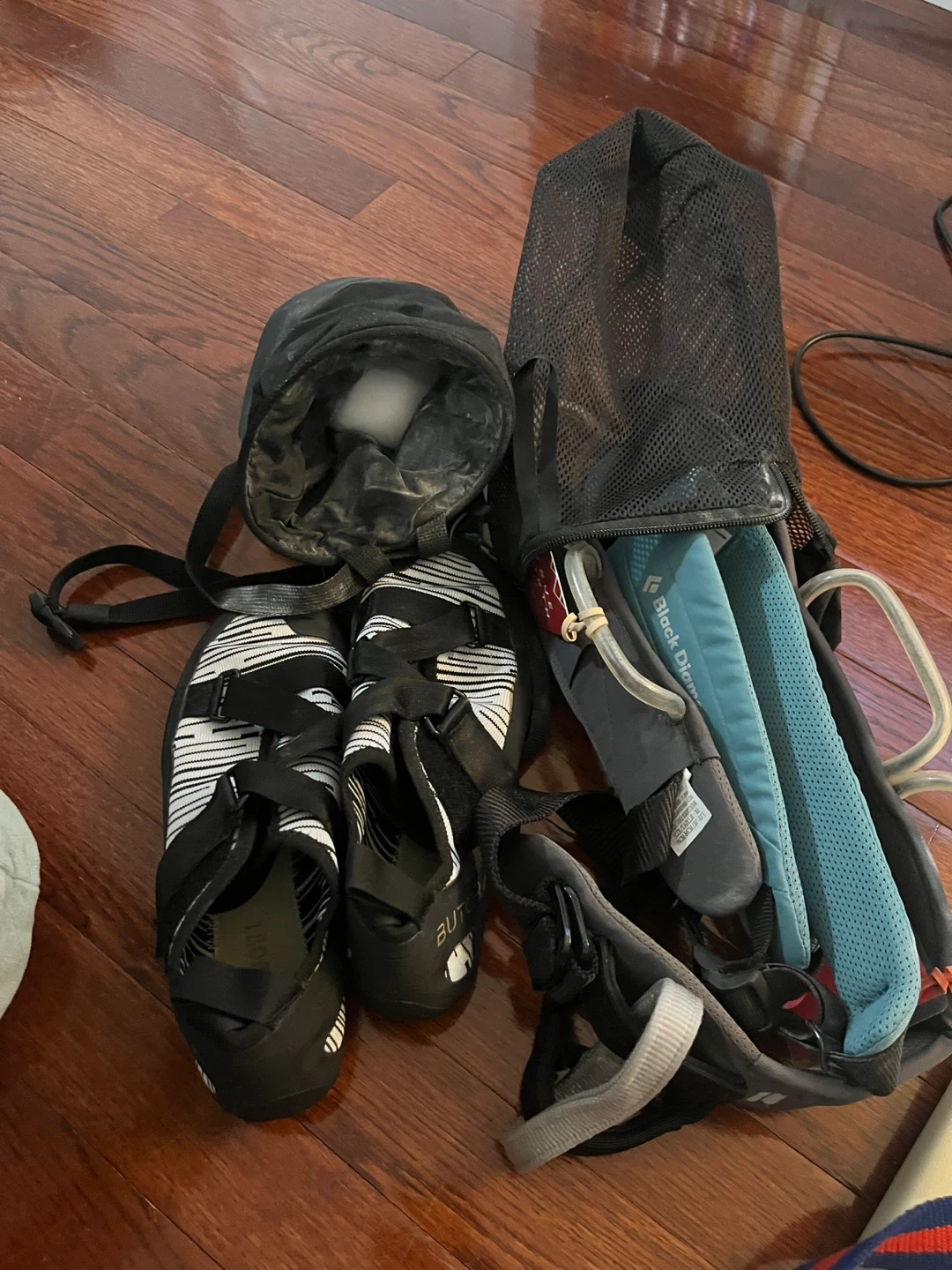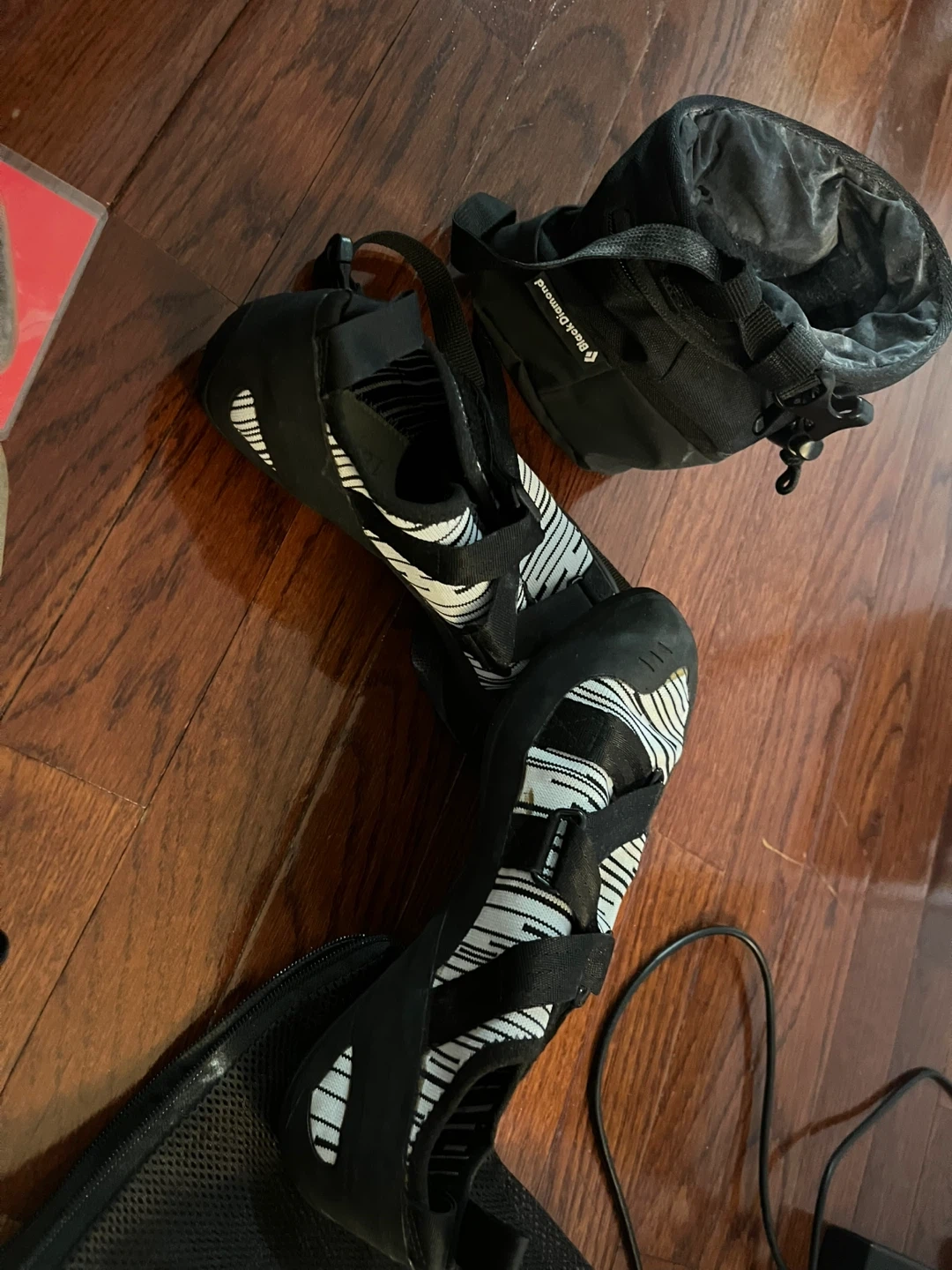Black Diamond Climbing Harness, Shoes, and Chalk Bag