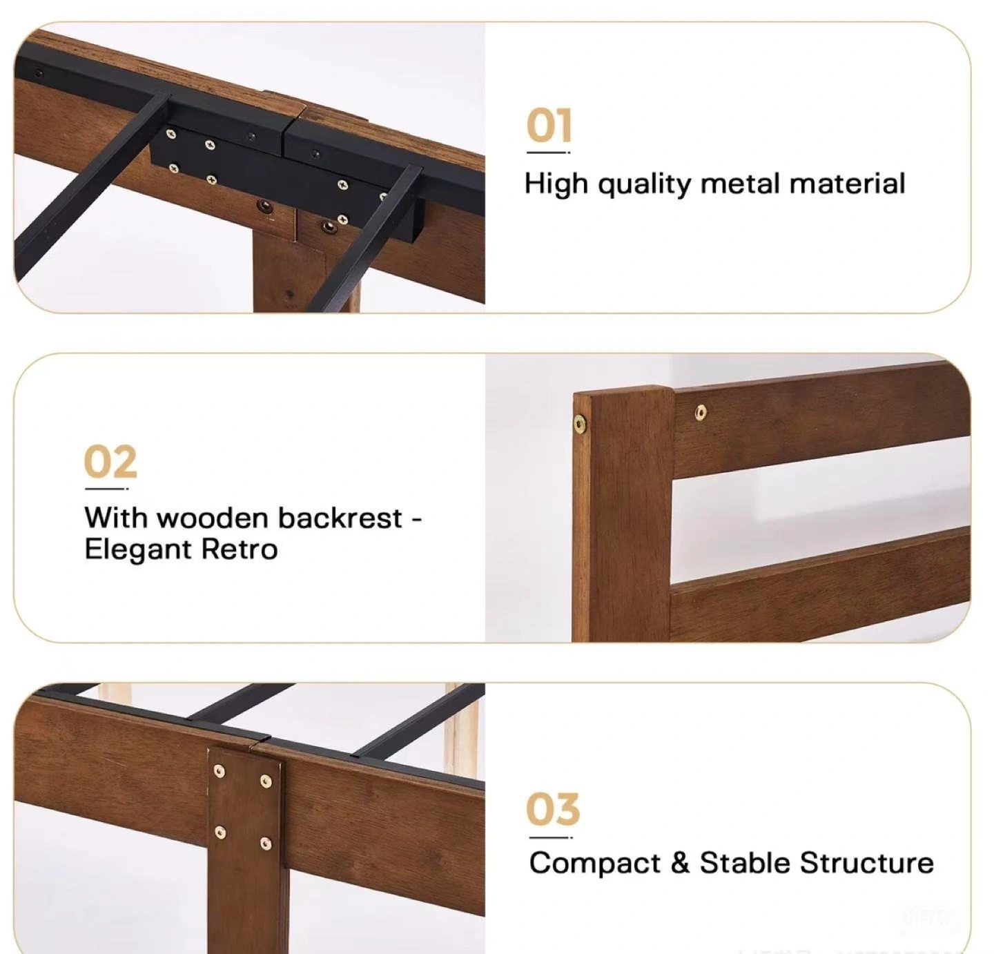 Brand new Sturdy queen-size platform bed frame. Features a wooden headboard and a metal support slat system. Supports up to 1600 lbs. Under-bed storage space available. Elegant retro design.