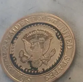 This is a commemorative coin featuring the Seal of the President of the United States. It's made of metal with a bronze-like finish. A great piece for collectors of presidential memorabilia.