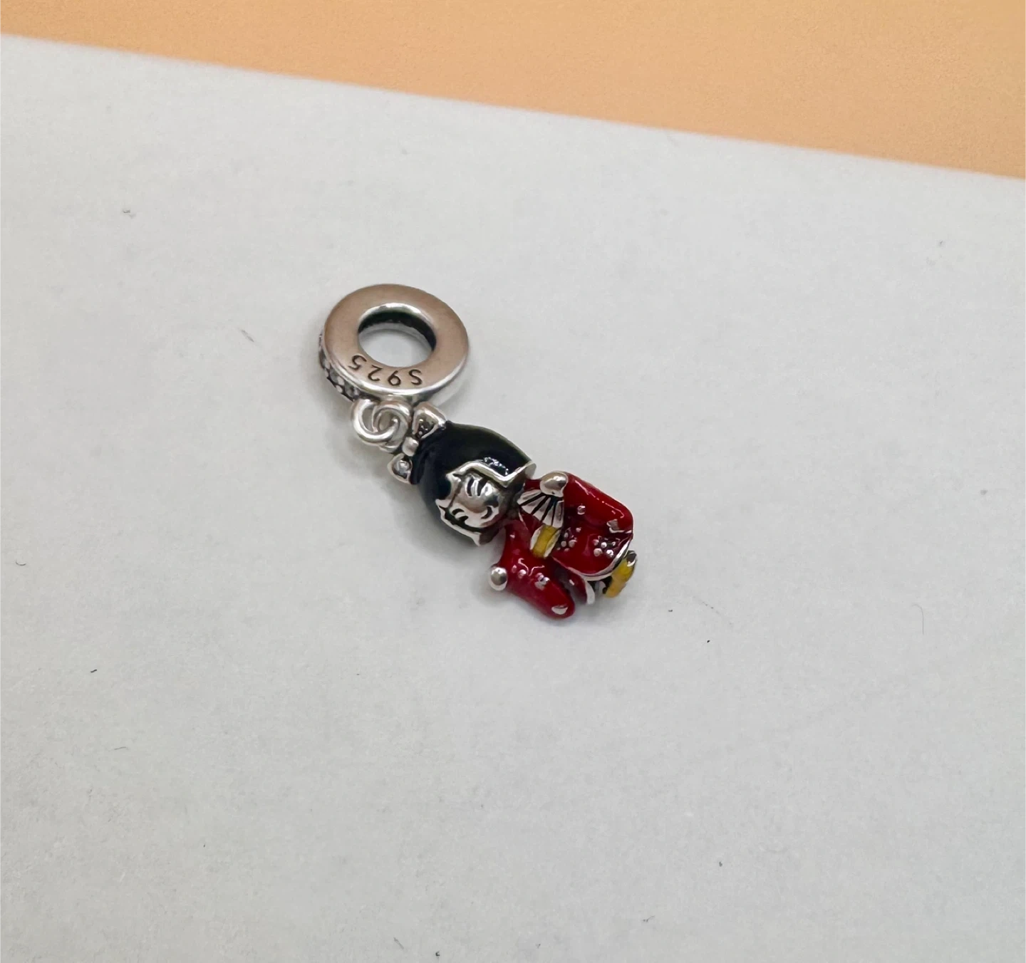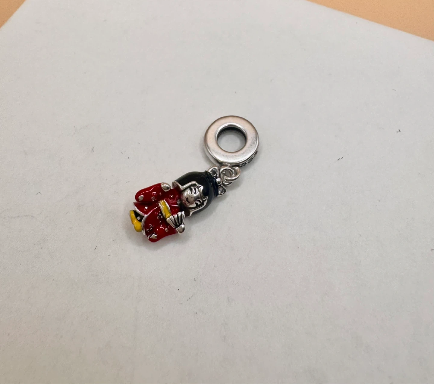 This S925 sterling silver charm features a detailed Queen's Guard figure. It's crafted with colourful enamel accents. This charm is perfect for adding a unique touch to your bracelet!