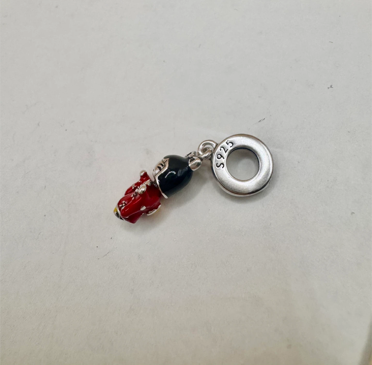 This S925 sterling silver charm features a detailed Queen's Guard figure. It's crafted with colourful enamel accents. This charm is perfect for adding a unique touch to your bracelet!