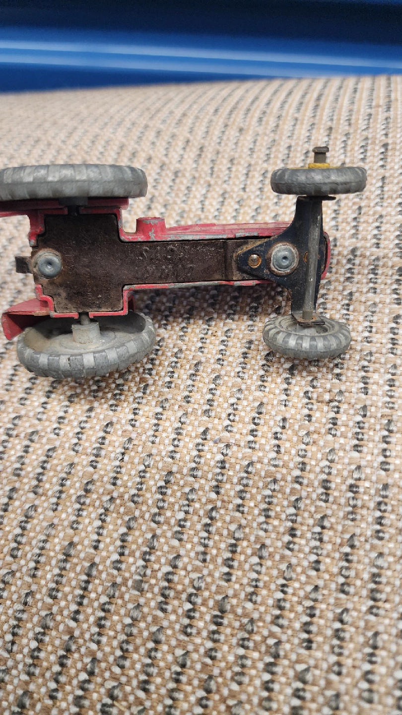 Selling a vintage Massey Harris Dinky Toy tractor with a manure spreader. It's red and shows some signs of wear, which adds to its vintage charm. Made in England by Meccano Ltd, this toy is a great collector's item!