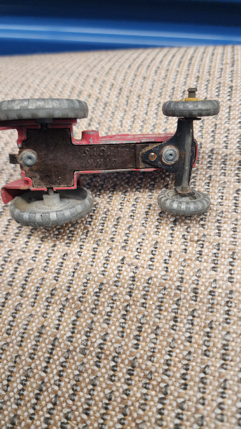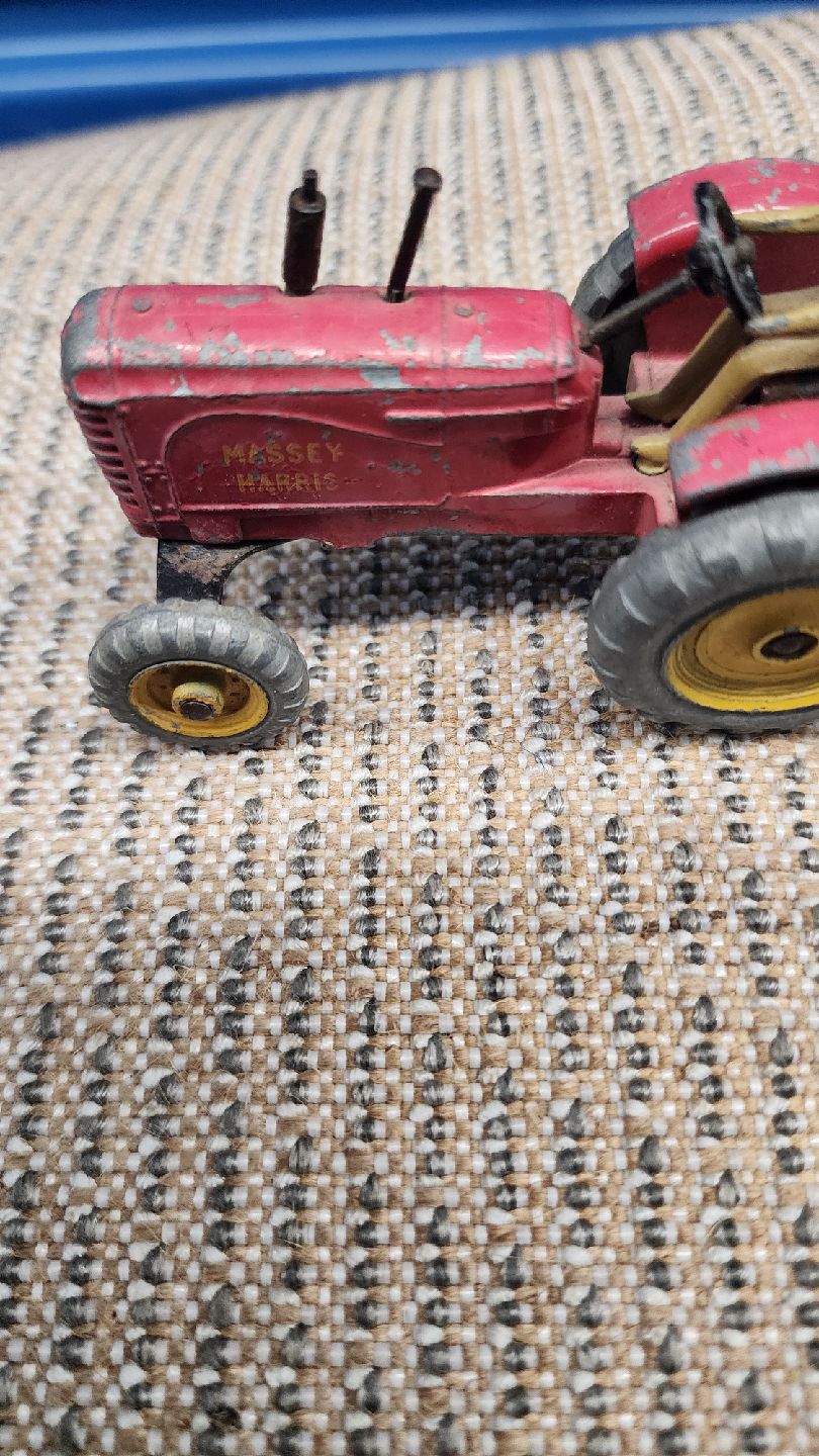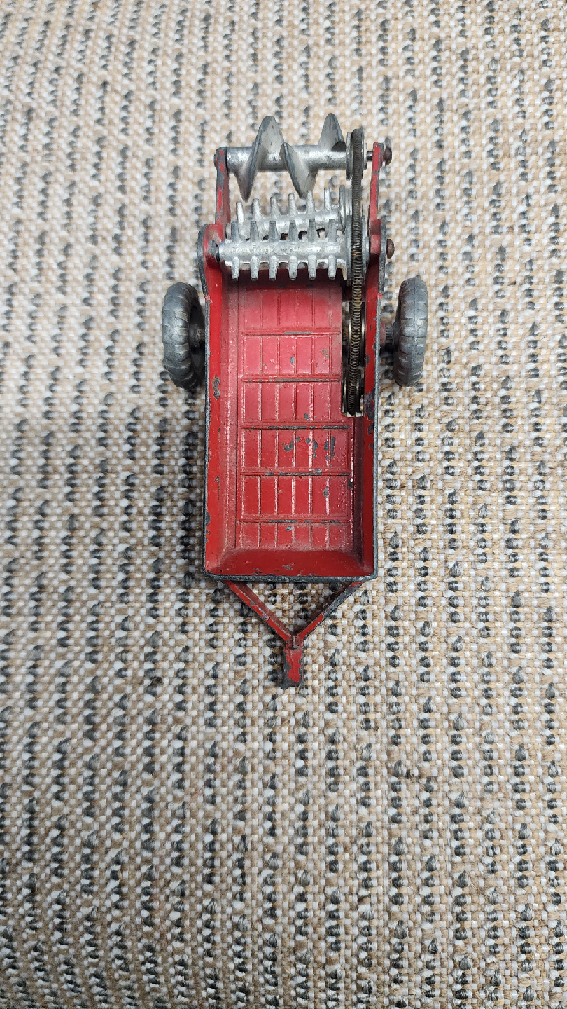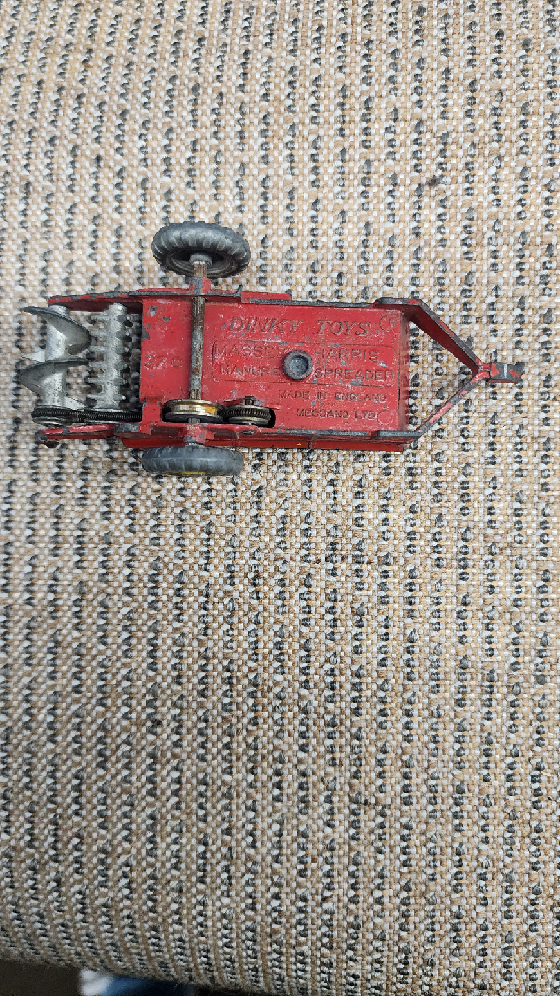 Selling a vintage Massey Harris Dinky Toy tractor with a manure spreader. It's red and shows some signs of wear, which adds to its vintage charm. Made in England by Meccano Ltd, this toy is a great collector's item!