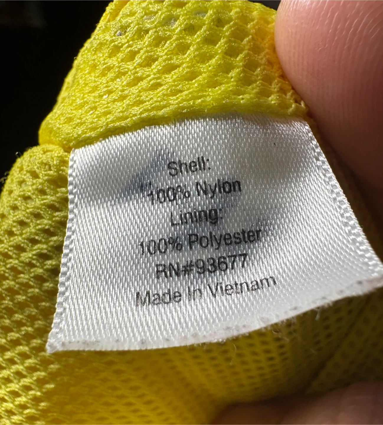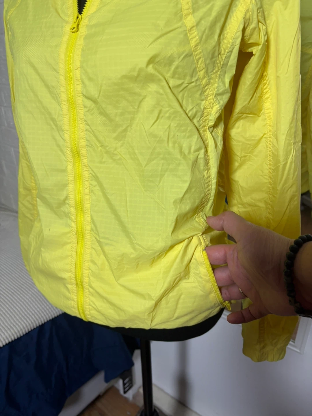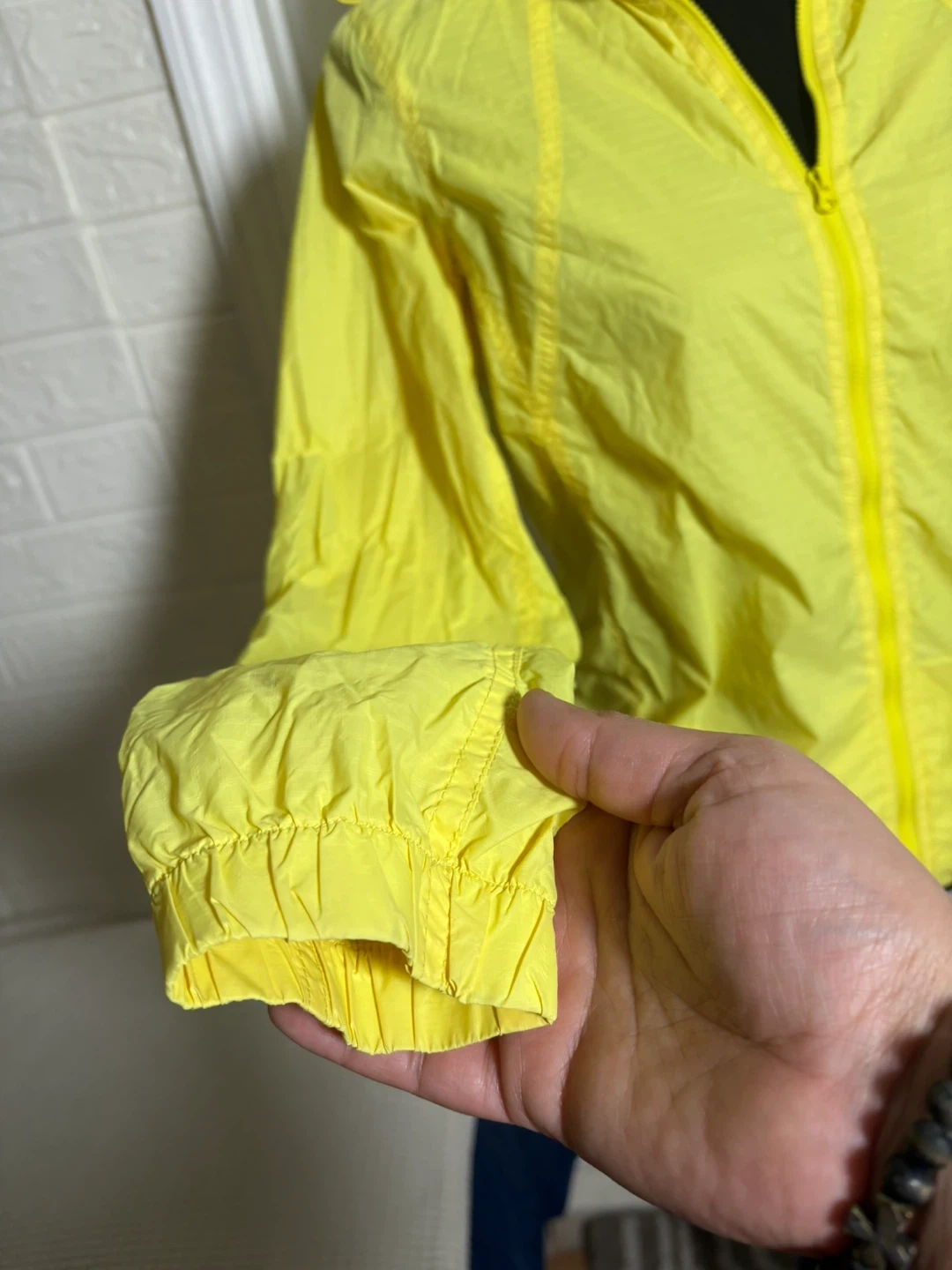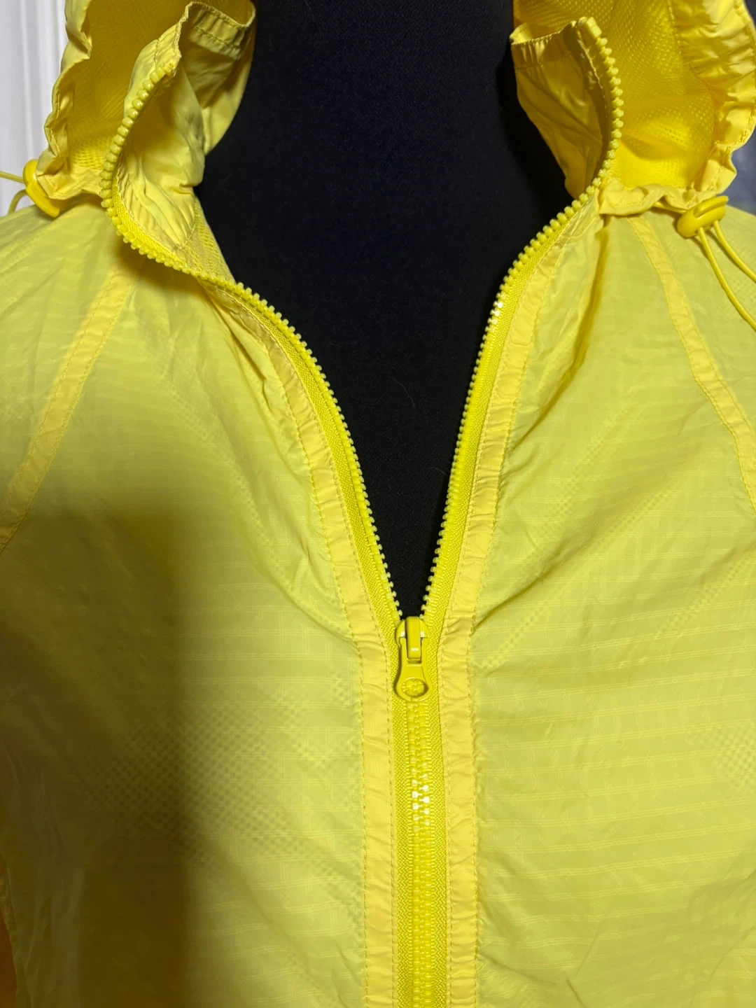 This is a lightweight, hooded jacket in a bright yellow color. It features a full zip closure and two front pockets. It's made from a crinkly, possibly water-resistant material.