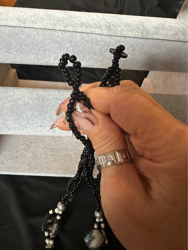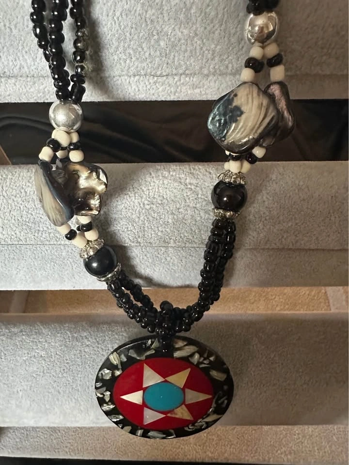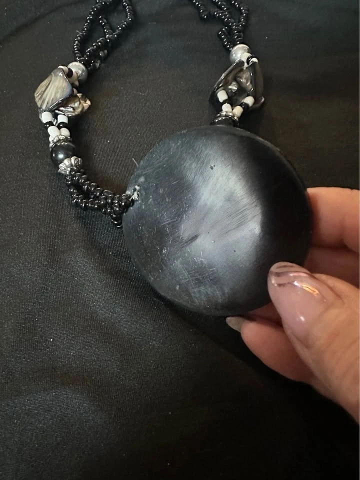 The main beads appear to be black, with some silver-tone accents and lighter-colored shell or stone pieces above the pendant.