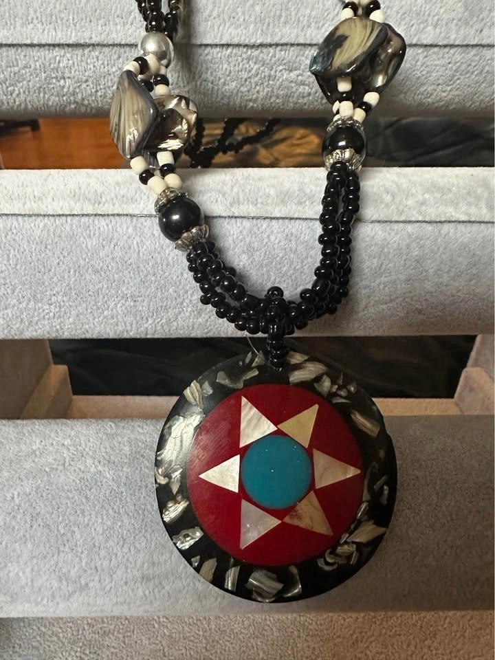 The pendant is made with inlay, possibly of mother of pearl, turquoise, or other stones set in a circular form, surrounded by a black, stone-like material, and a clear top layer. 21 inches long. Pick up Welland.