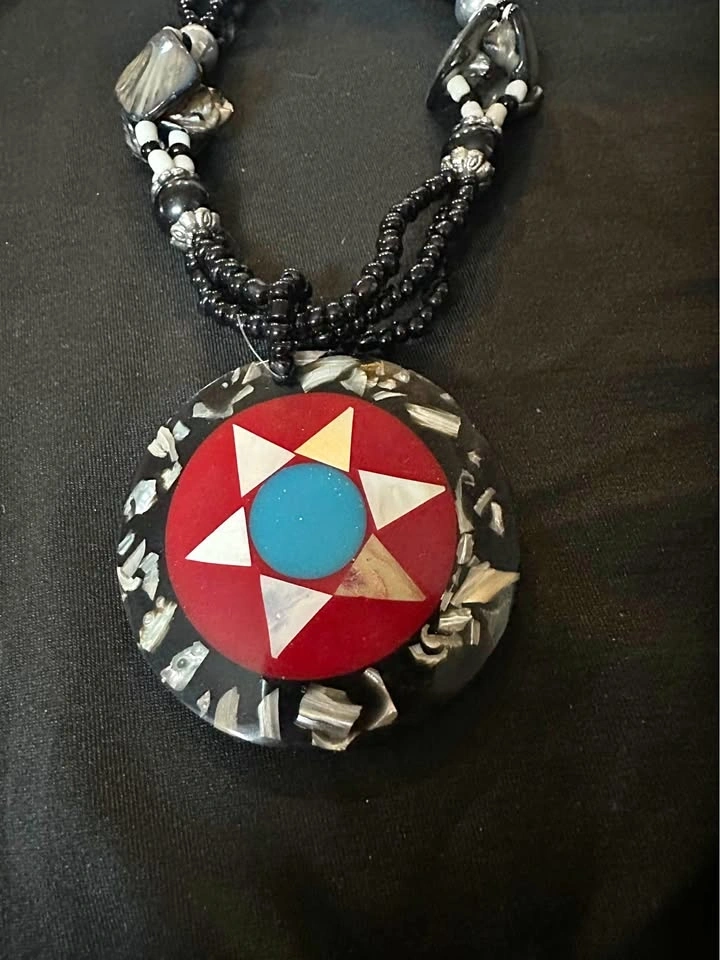 This necklace features a prominent round pendant with an intricate red, white, and blue star or sunburst pattern at the center.