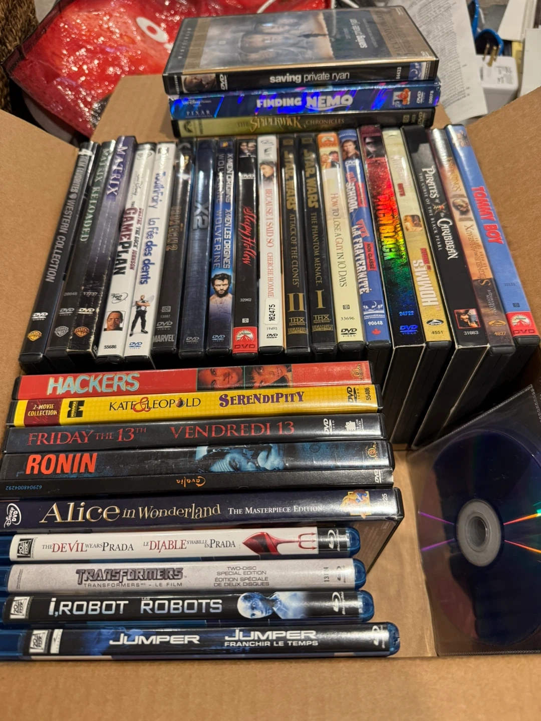 Selling a collection of DVDs and Blu-ray movies. Titles include: Saving Private Ryan, Finding Nemo, The Spiderwick Chronicles, X-Men Origins: Wolverine, Star Wars, Alice in Wonderland, Transformers, iRobot, and many more! Great for movie nights or expanding your collection! Porch pick up only.