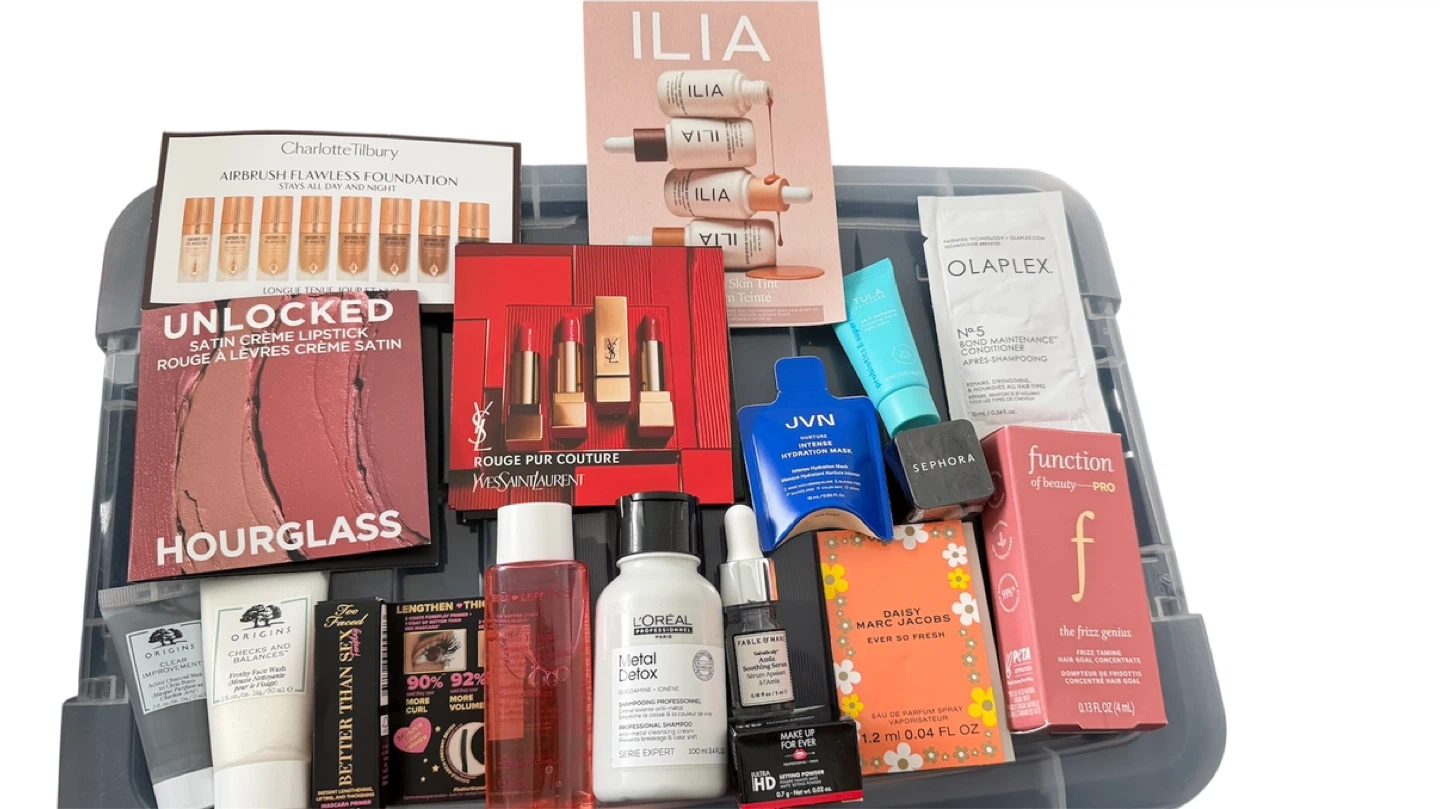This is a collection of various makeup and skincare items. Includes brands like Hourglass, YSL, L'Oréal, and Olaplex. Products range from lipstick and foundation samples to shampoos and conditioners.