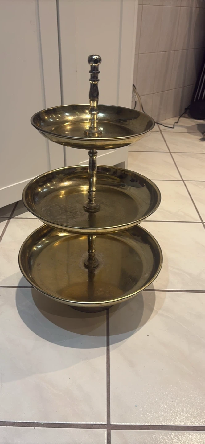 Brass 3-tier serving stand for snacks or appetizers. It's a sturdy piece with a decorative central column. This stand's perfect for parties or special occasions! this is a vintage collectable