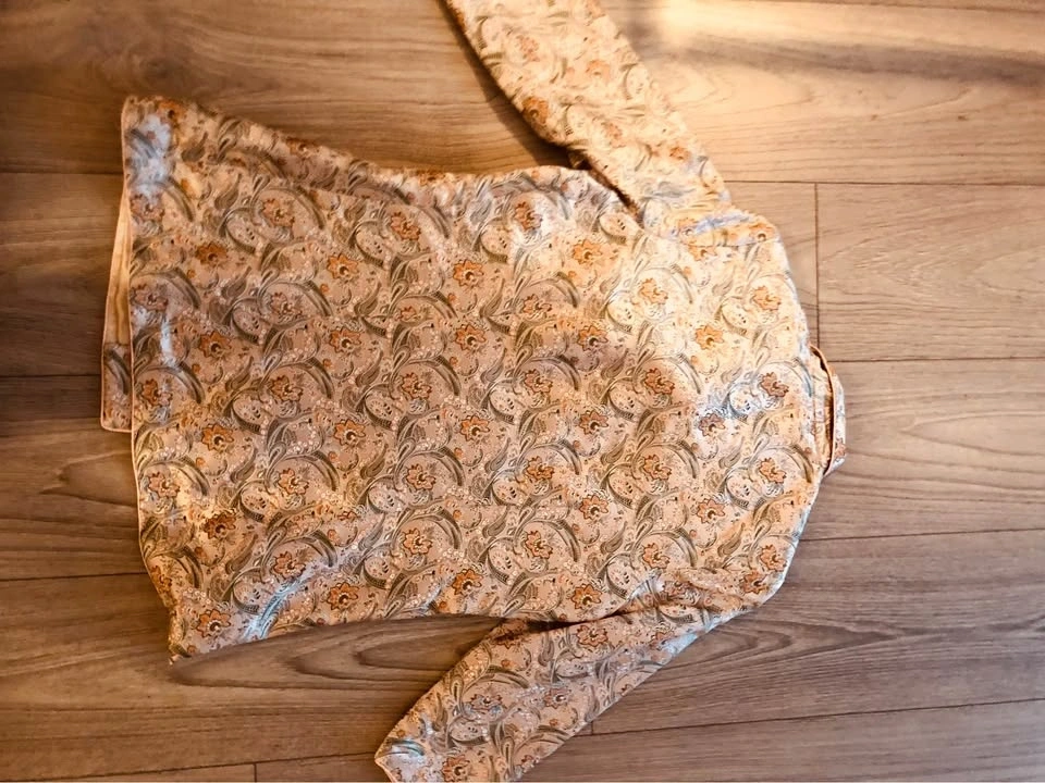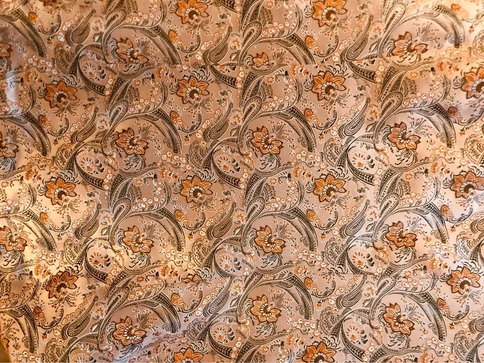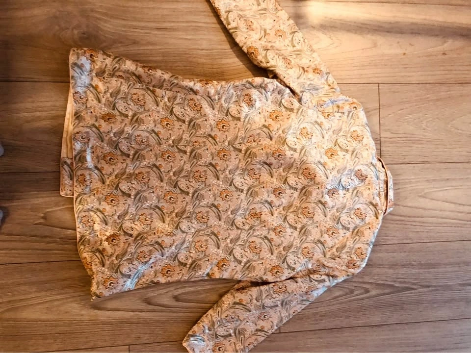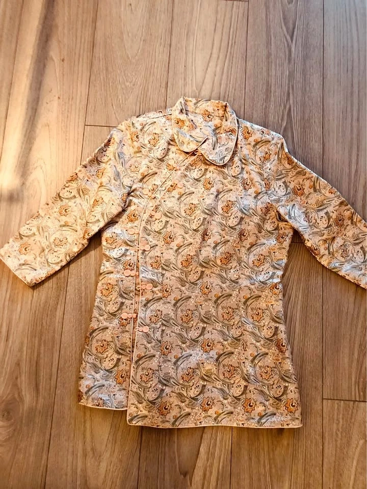 This is a Tangzhuang, also known as a Tang suit jacket. It's a traditional-style Chinese jacket designed for women, often worn for cultural festivals or as a decorative outer layer. It features a rounded Peter Pan collar and a diagonal side-opening closure, a relaxed, modern take on traditional Chinese silhouettes. Fastenings use frog buttons (pankou), which are hand-braided fabric fasteners in a "loop and ball" style. The material is a brocade with a dense floral and paisley pattern, featuring a slight sheen and made from a synthetic blend like polyester or rayon for structure. The care label indicates it was produced in Mainland China. Care instructions advise against machine washing, tumble drying, bleaching, wringing, prolonged soaking in cold water, or direct sunlight to protect the fabric. Chest is 34 inches.