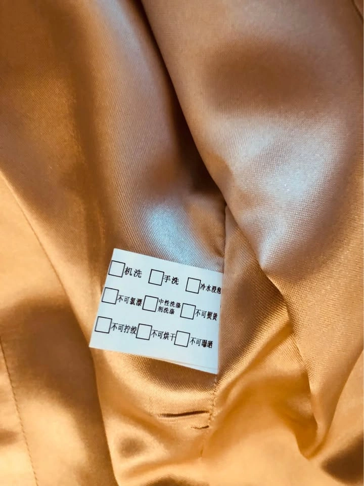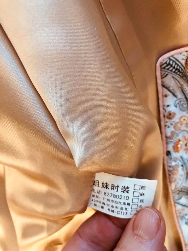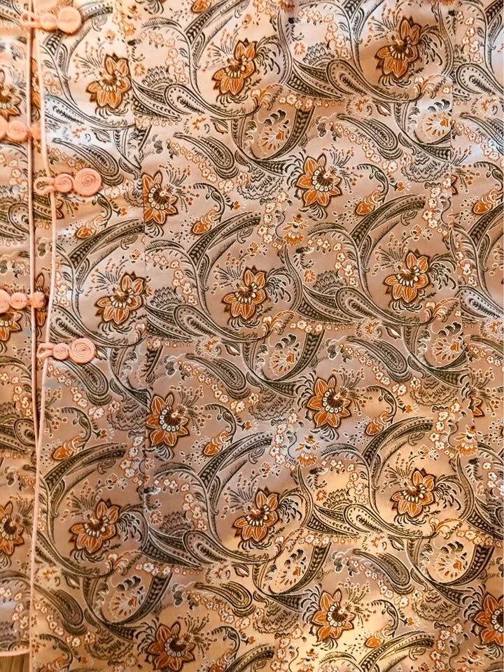 This is a Tangzhuang, also known as a Tang suit jacket. It's a traditional-style Chinese jacket designed for women, often worn for cultural festivals or as a decorative outer layer. It features a rounded Peter Pan collar and a diagonal side-opening closure, a relaxed, modern take on traditional Chinese silhouettes. Fastenings use frog buttons (pankou), which are hand-braided fabric fasteners in a "loop and ball" style. The material is a brocade with a dense floral and paisley pattern, featuring a slight sheen and made from a synthetic blend like polyester or rayon for structure. The care label indicates it was produced in Mainland China. Care instructions advise against machine washing, tumble drying, bleaching, wringing, prolonged soaking in cold water, or direct sunlight to protect the fabric. Chest is 34 inches.