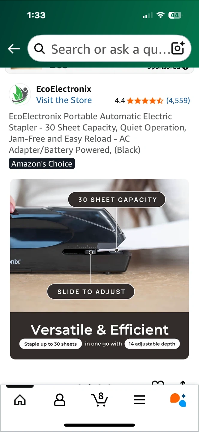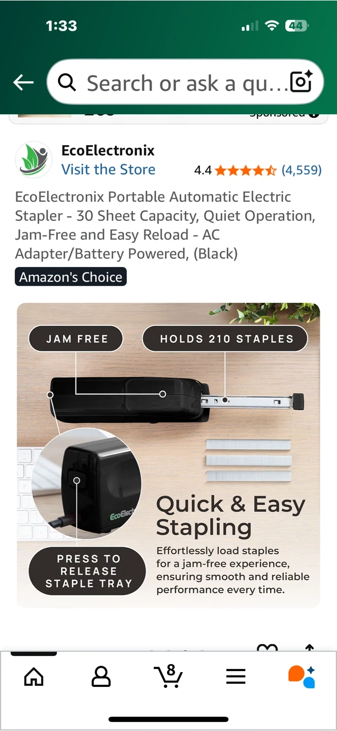 EcoElectronix portable automatic electric stapler. This stapler has a 25-sheet capacity and offers quiet operation. It features jam-free and easy reload capabilities, and can be powered by an AC adapter or batteries. It's a versatile and efficient tool for all your stapling needs! Originally bought for $75.99