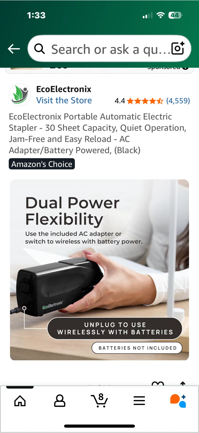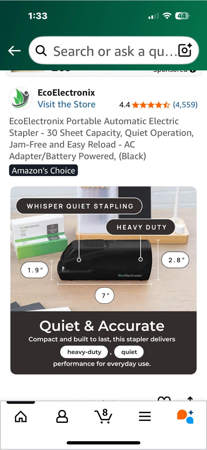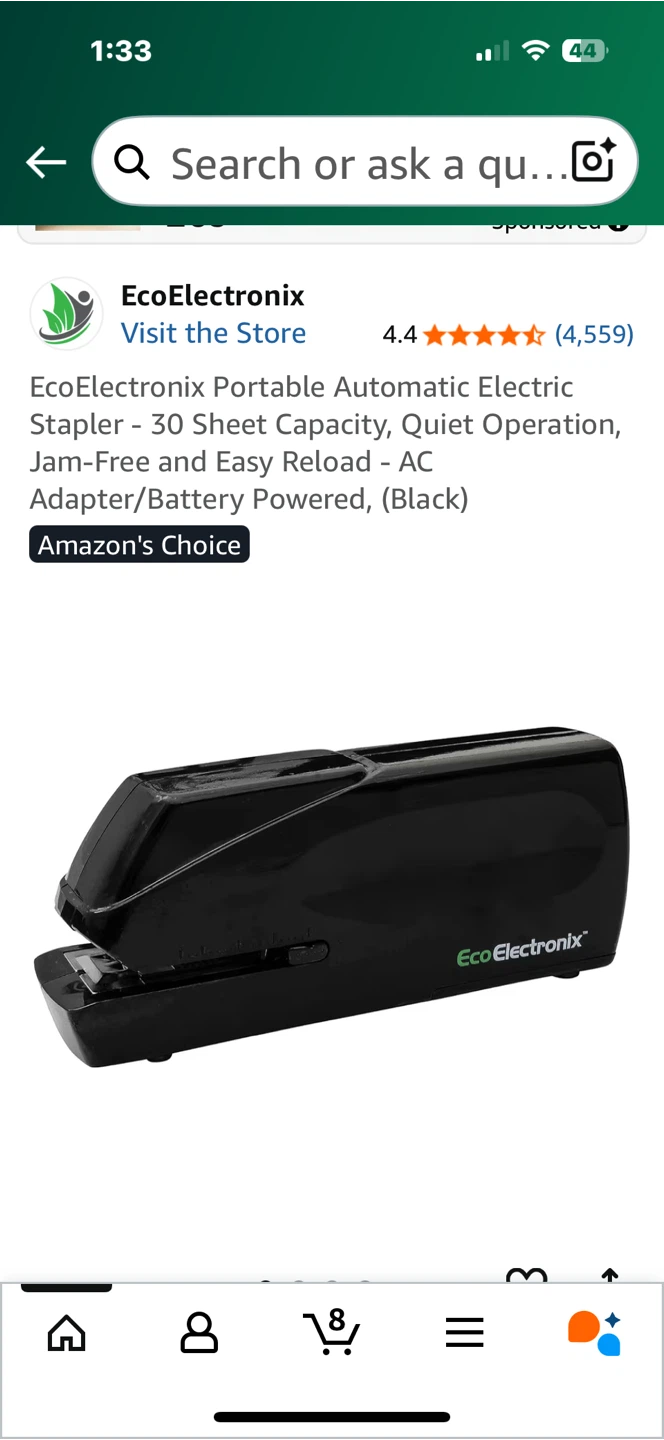 EcoElectronix portable automatic electric stapler. This stapler has a 25-sheet capacity and offers quiet operation. It features jam-free and easy reload capabilities, and can be powered by an AC adapter or batteries. It's a versatile and efficient tool for all your stapling needs! Originally bought for $75.99