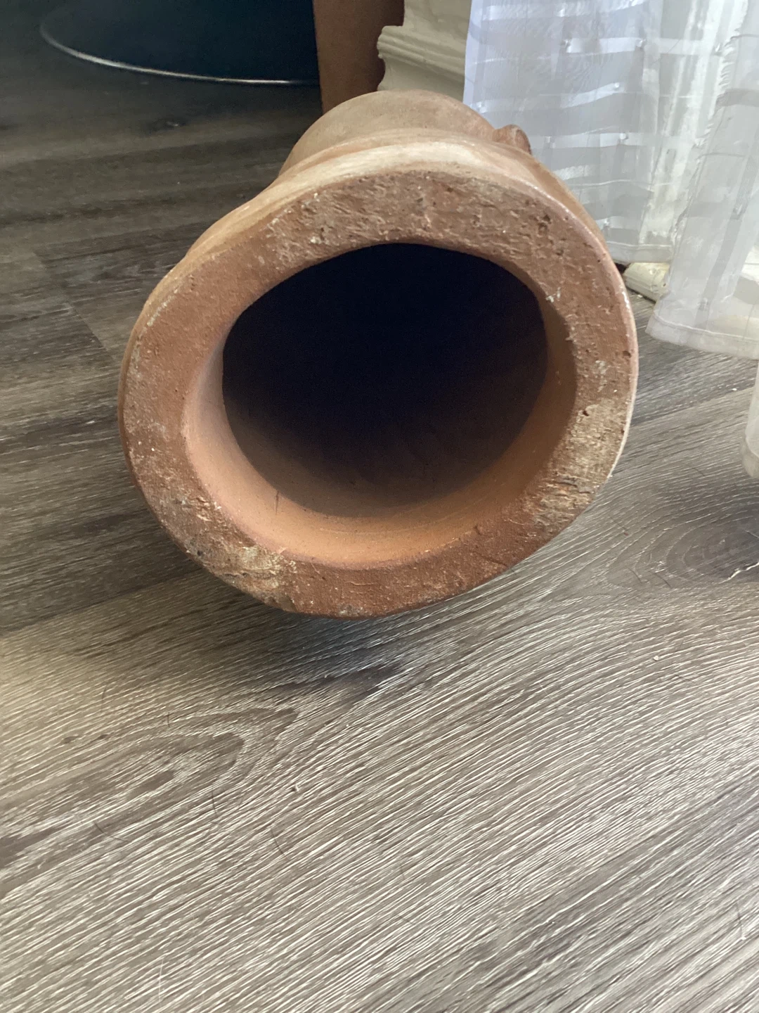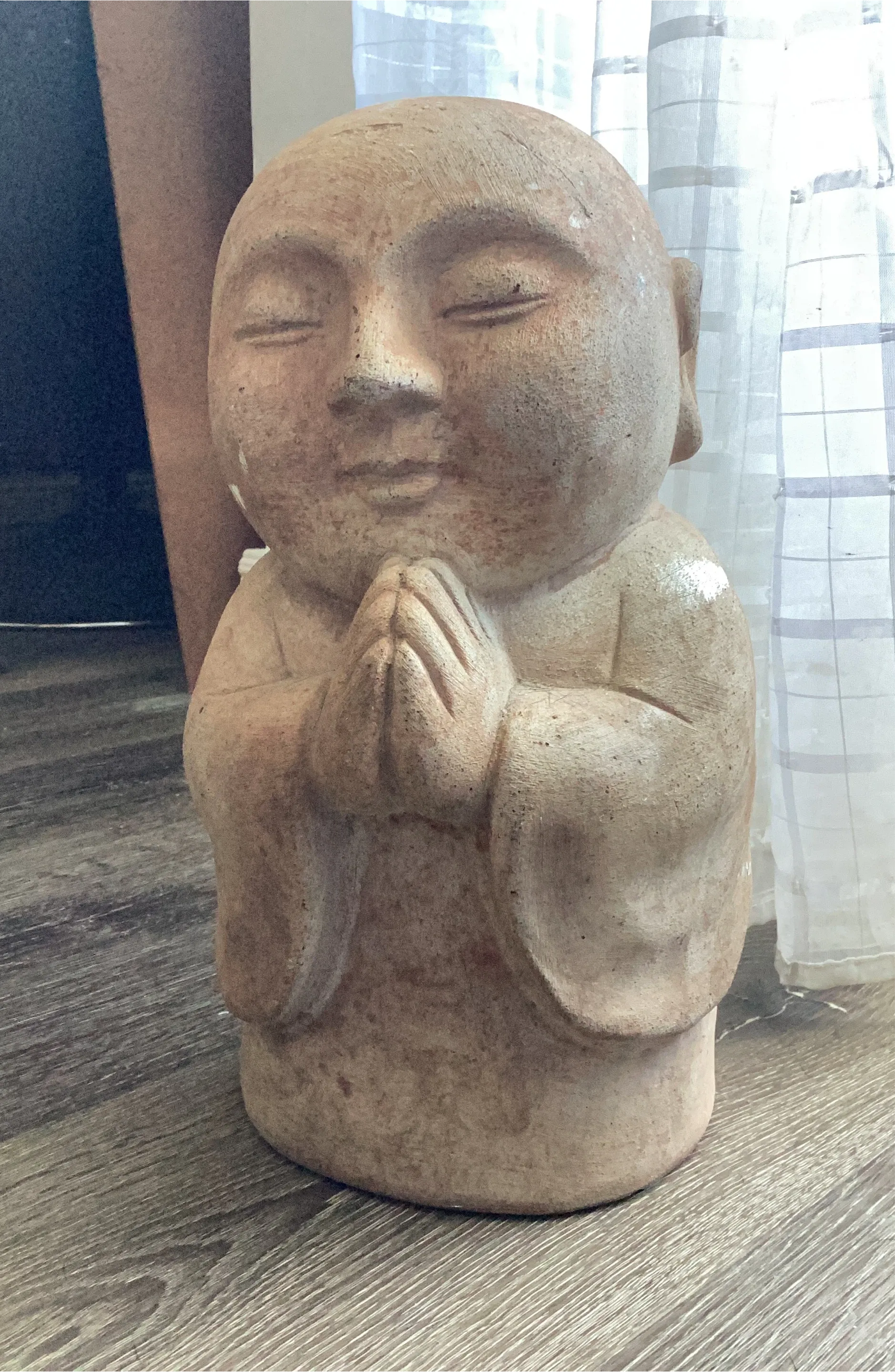 This is a charming terracotta statue of a praying monk. It's hollow and would make a nice decorative piece. It's made of clay and has a rustic, weathered look.