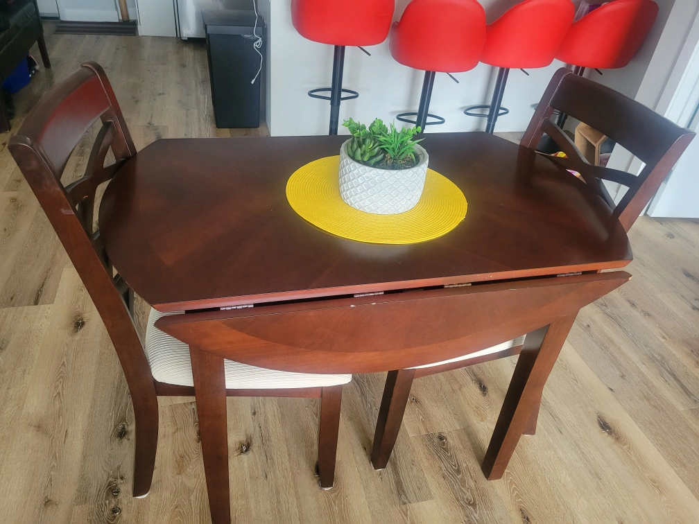 Dark brown wooden table, two chairs. Table expands. Beige fabric chair seats. Good for small spaces.