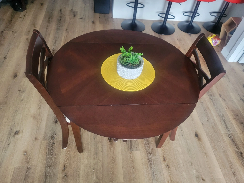 Dark brown wooden table, two chairs. Table expands. Beige fabric chair seats. Good for small spaces.