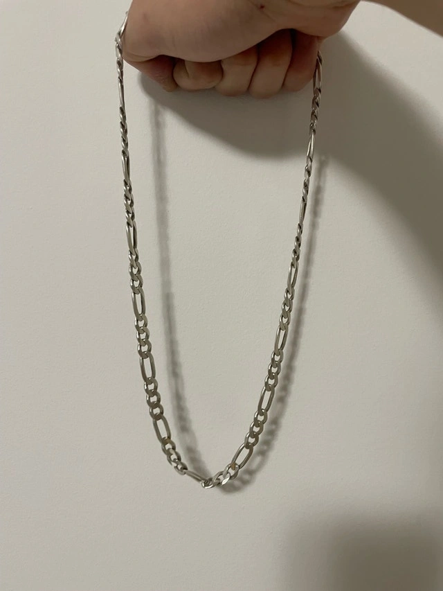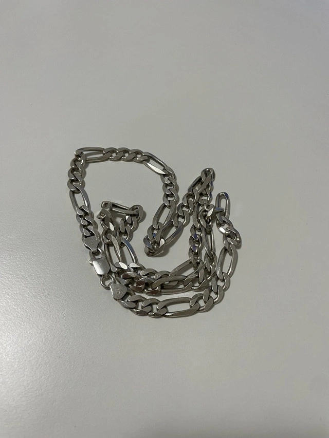 Authentic Italian-made 925 sterling silver Figaro chain. Solid and heavy piece with a clean, classic look. Made in Italy. 925 Sterling Silver. Length: 24 inches. Weight: 55.28 grams. Strong clasp, great condition. Perfect for daily wear or layering.