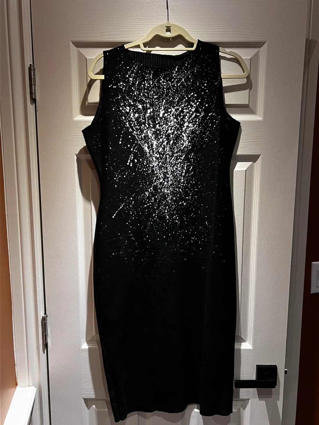 ANIMAPOP sleeveless black dress. Features a unique white splatter design across the front. Dress is made of a knit material.