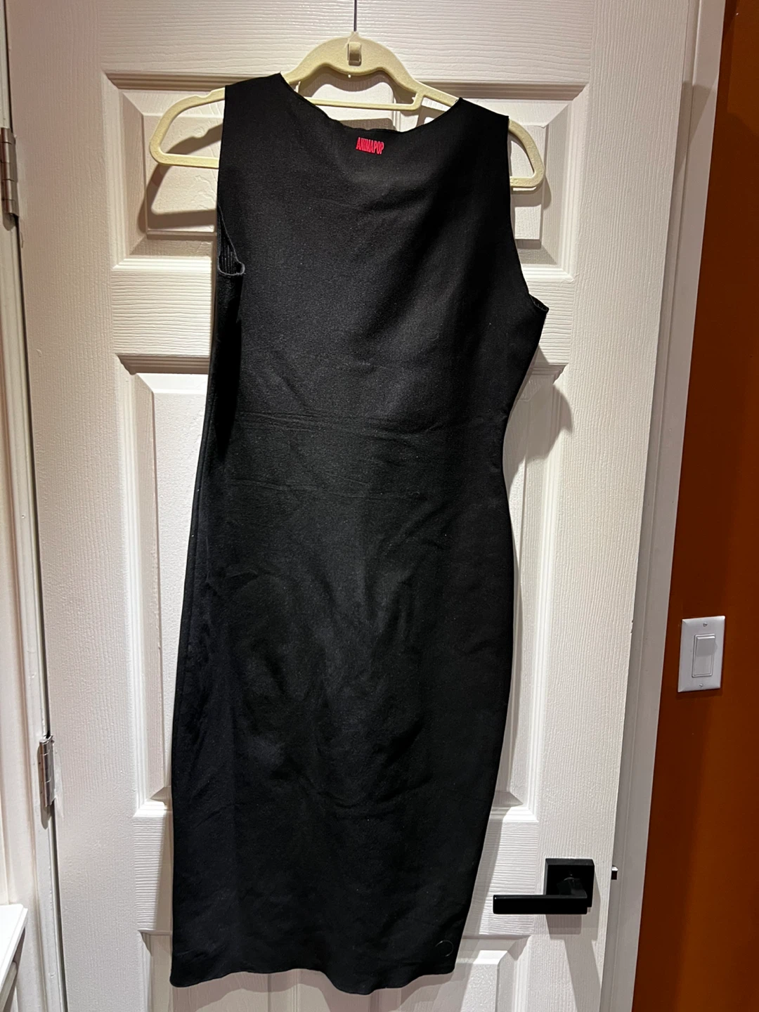 ANIMAPOP sleeveless black dress. Features a unique white splatter design across the front. Dress is made of a knit material.