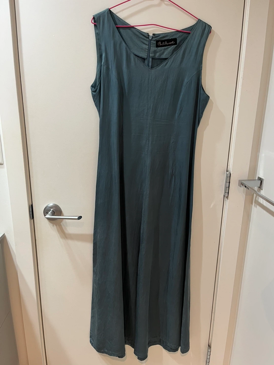 This teal maxi dress is sleeveless with a V-neckline. It's a Chatoune brand. Dress length hits around the ankles.