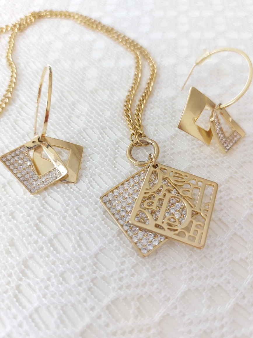 Selling a beautiful necklace and earrings set. The necklace features a square pendant with the Dior logo cutout and a pave crystal detail. The earrings are hoop style with a similar square charm. This set is in great condition and would be a stunning addition to any jewelry collection!