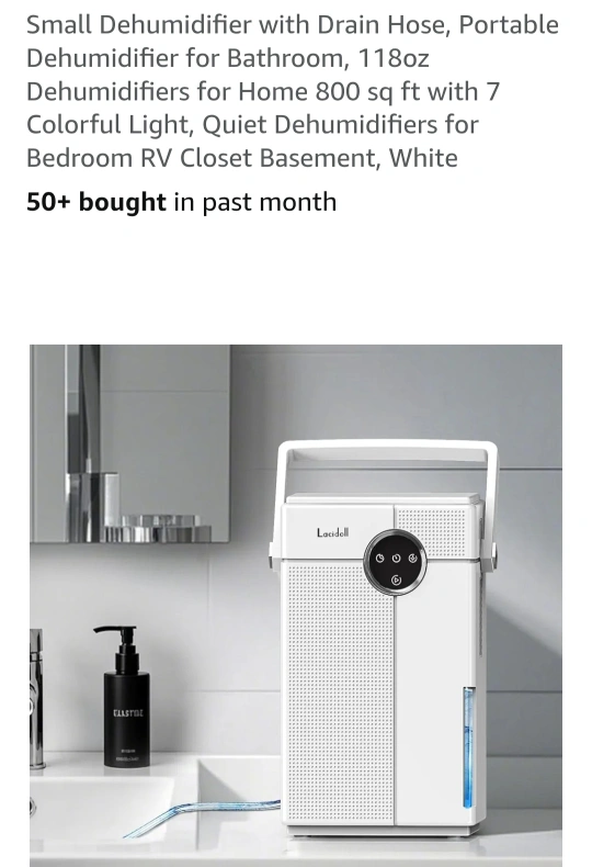 Selling a Lacidoll portable dehumidifier, perfect for bathrooms or smaller spaces! It's in excellent condition and ready to help keep your home dry and comfortable. This dehumidifier is designed for spaces up to 800 sq ft and features a 118oz capacity. It also has 7 colourful lights and operates quietly, making it ideal for bedrooms, RVs, closets, or basements