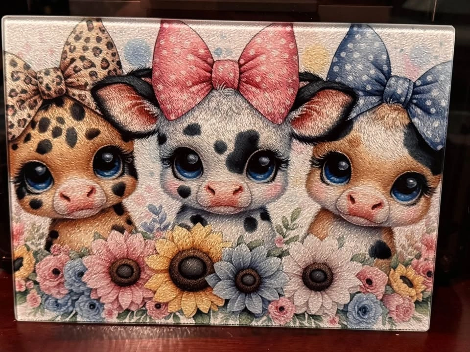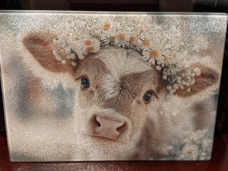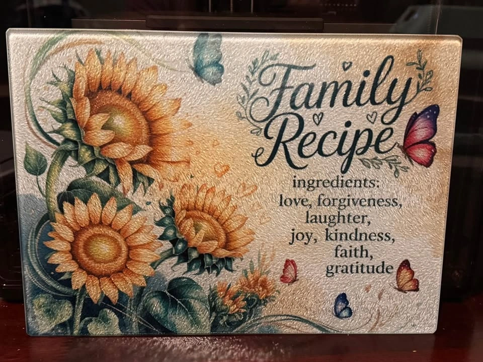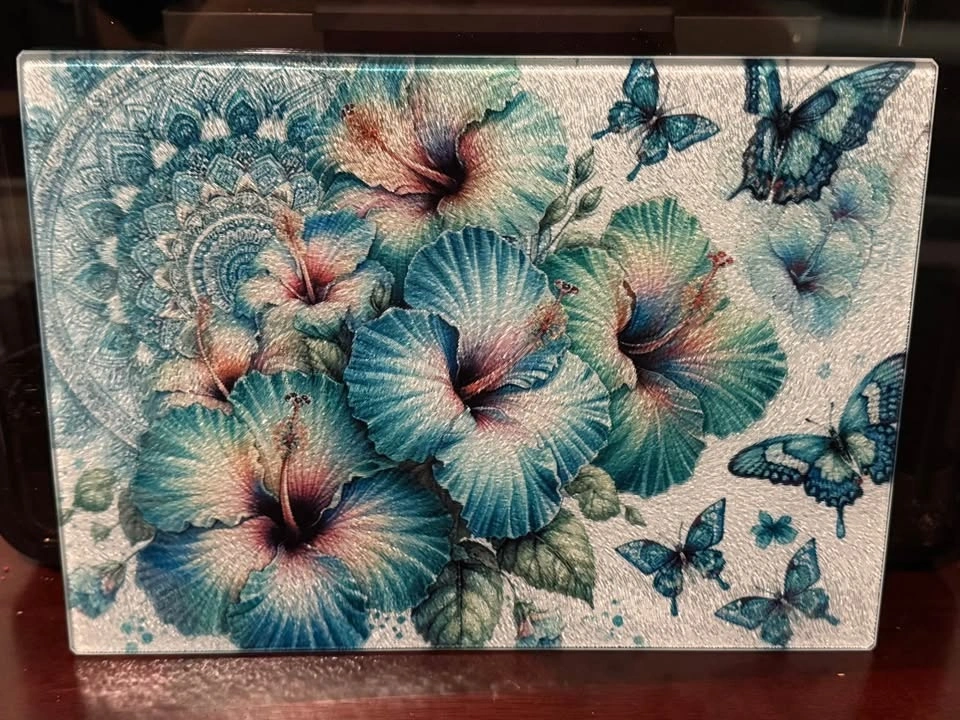 Currently taking orders for custom glass cutting boards. 8x11 in size. Choose from one of our ready to go (photos shown) or ask for something custom. $25 each.