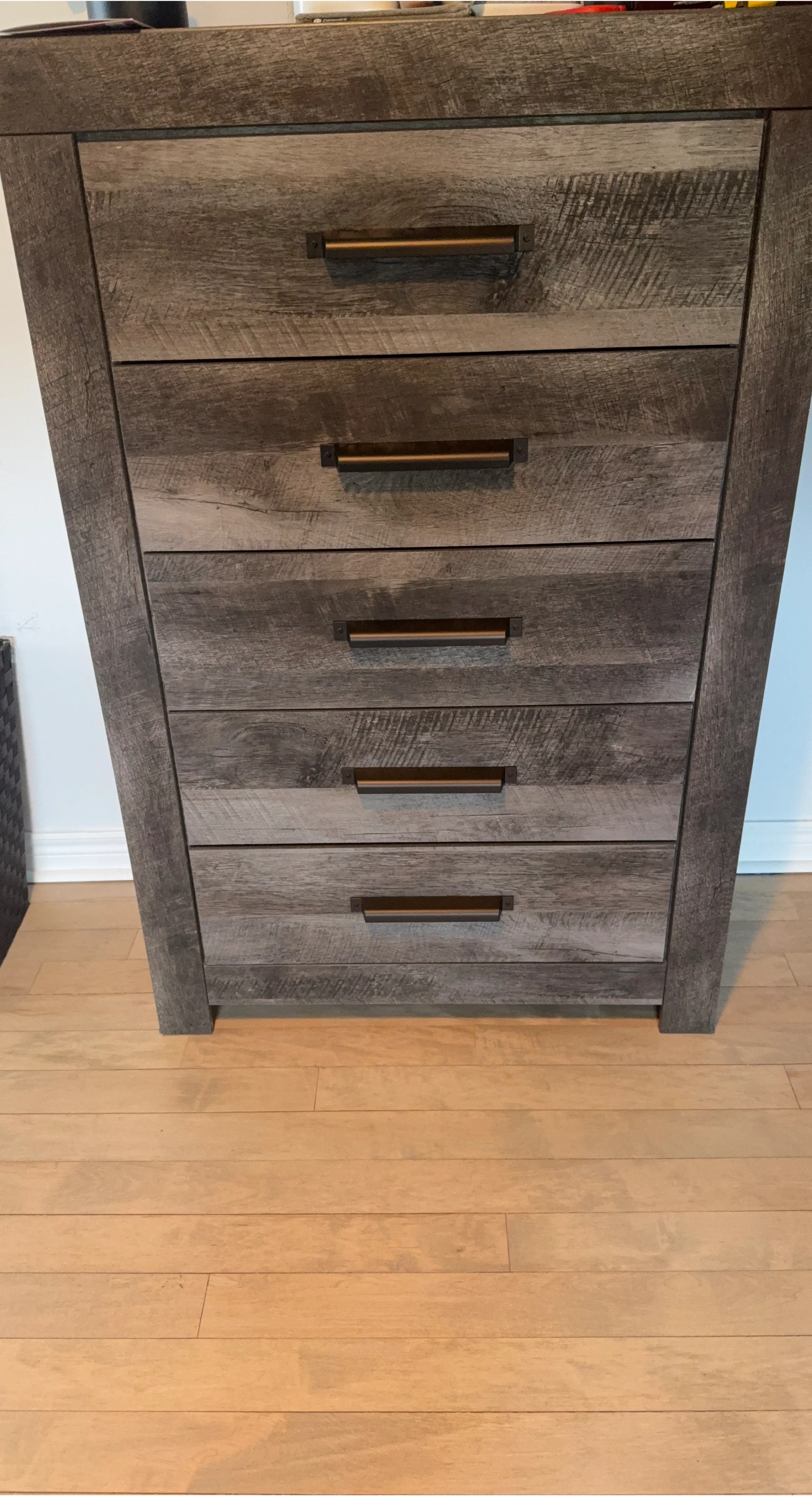 This dresser features a rustic wood finish and five spacious drawers. Its design incorporates dark bronze handles for a modern touch. It's a great storage solution for bedrooms or living spaces.