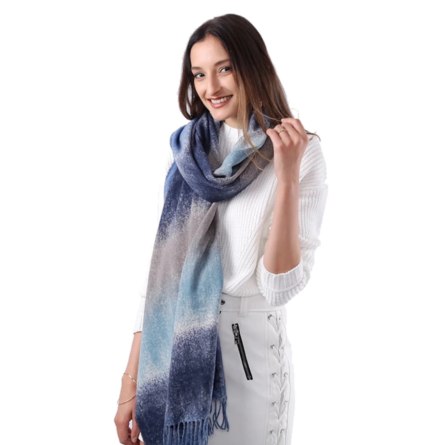 - The scarf features a lovely blend of blues and greys in a striped ombre pattern.