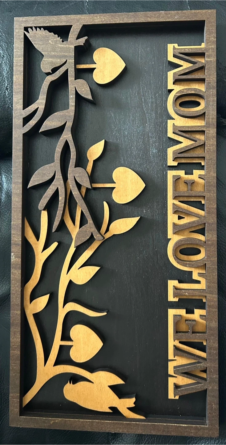Decorative wooden sign featuring birds and hearts with the words "WELCOME MOM" cut out. It's made of layered wood with a dark background.