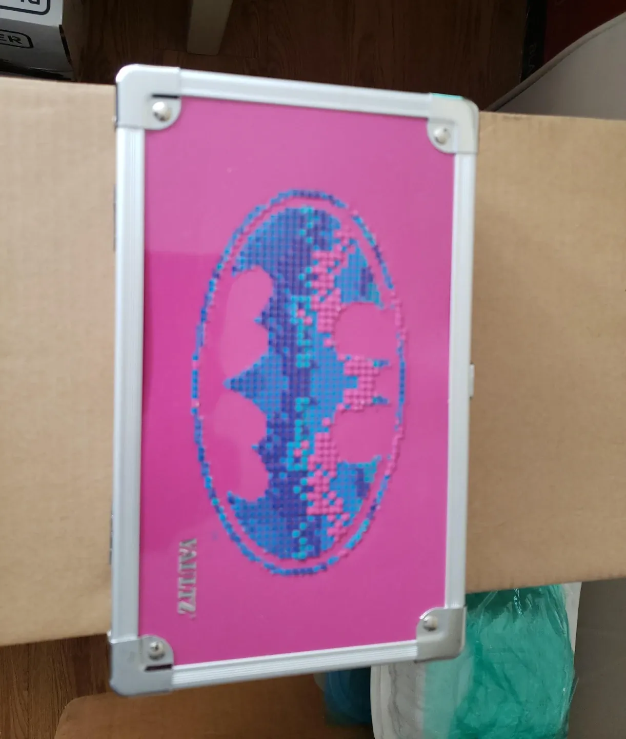 This is a pink vanity case with a silver trim. It features a unique blue and pink pixelated design on the lid. The brand name 'YALILTZ' is visible.