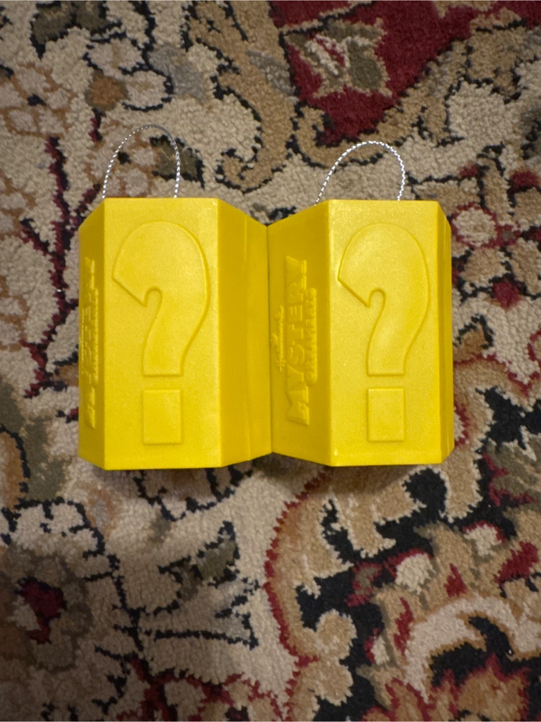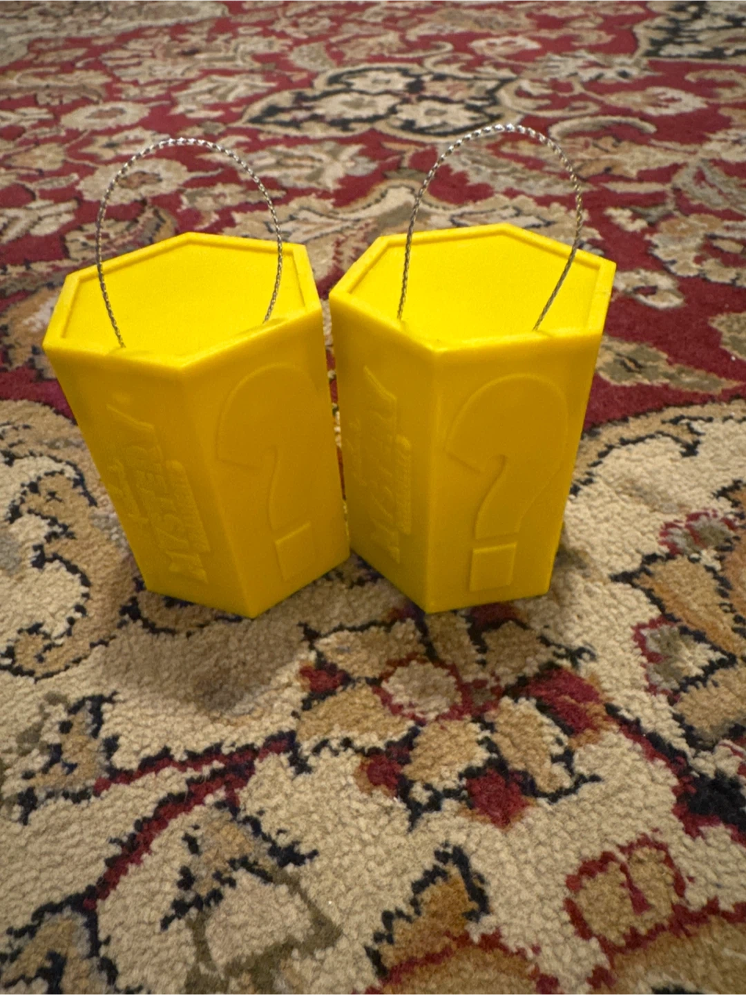 Two bright yellow hexagonal containers, each with a wire handle. The sides feature embossed question marks. One bucket has 'MYSTERY BUCKET' embossed on its side. These are great for collecting small items or for party favors!