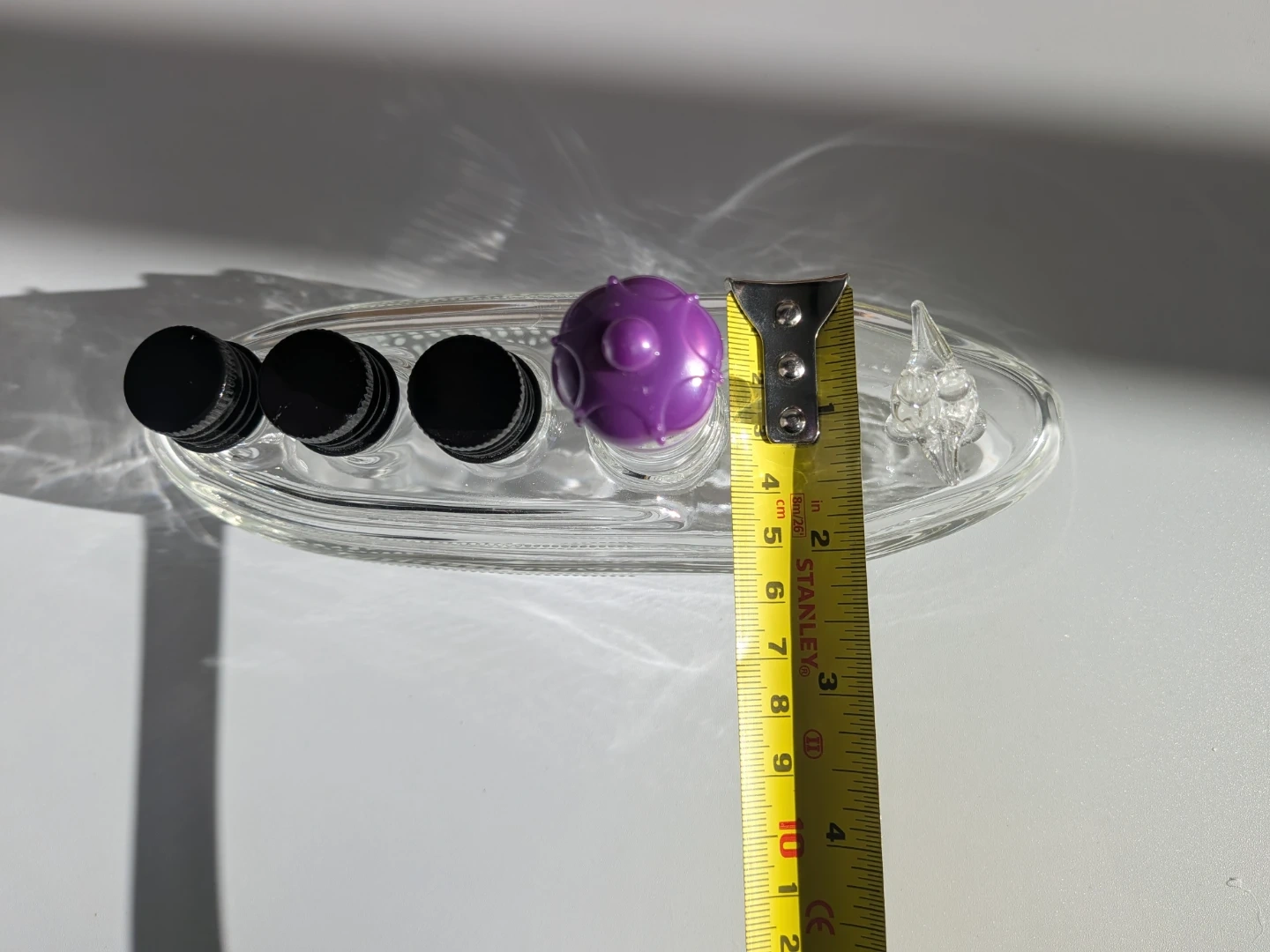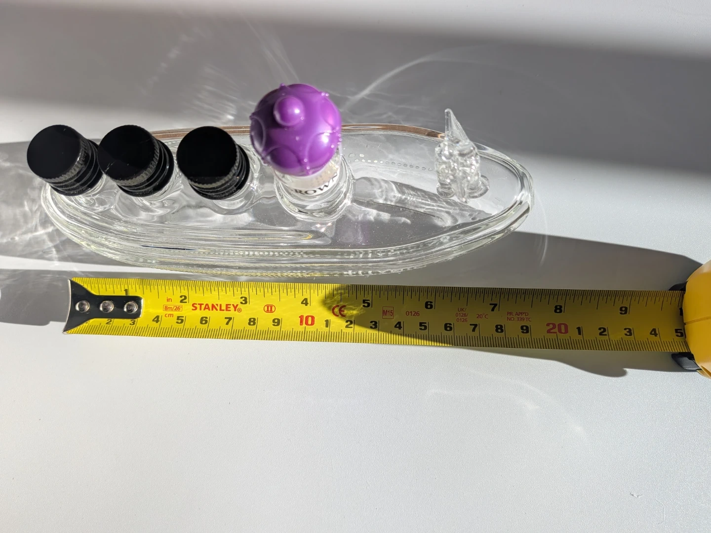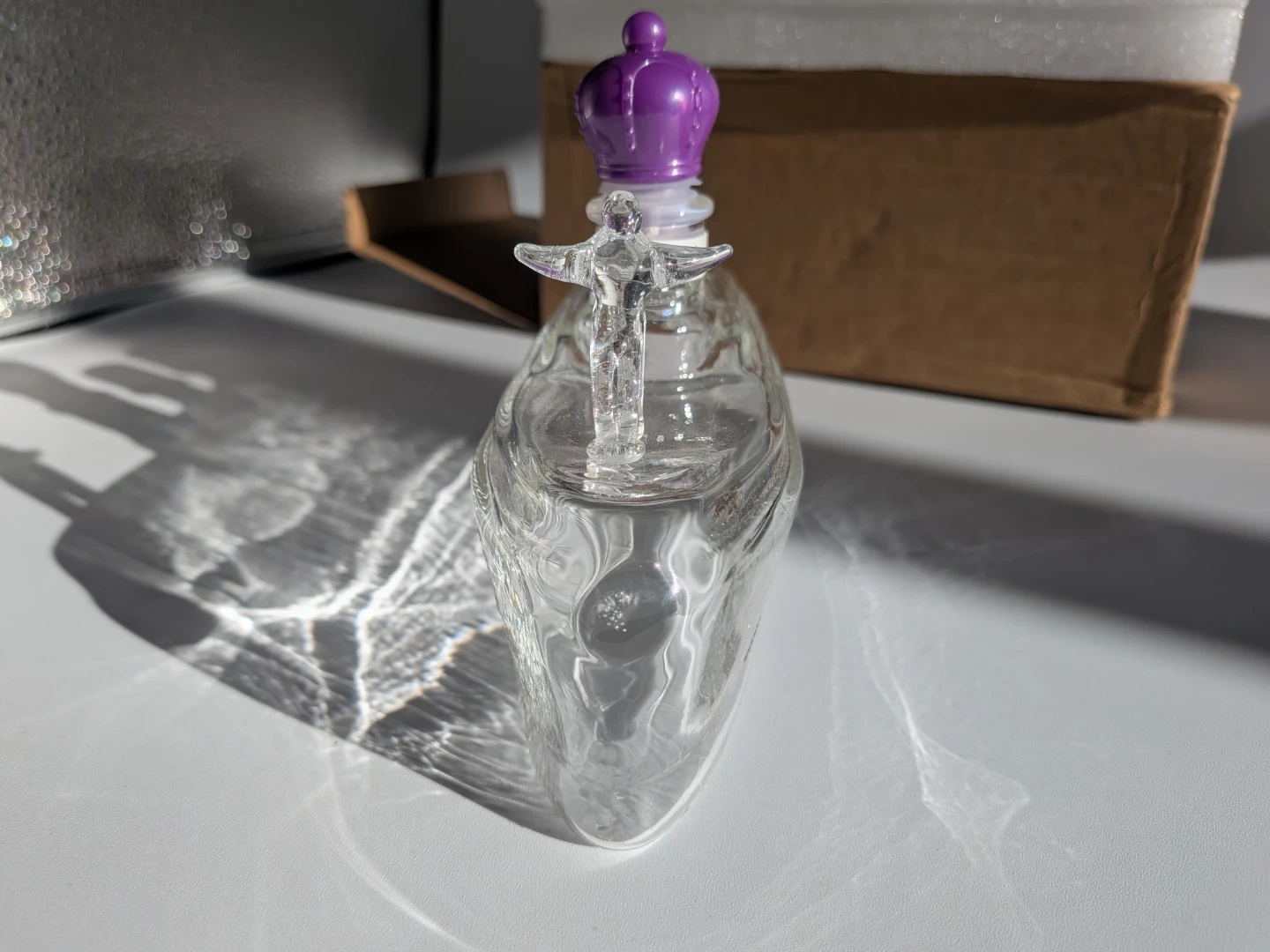 A decorative glass bottle shaped like the Titanic ship. It features a purple crown stopper and a glass figure at the stern. The bottle has four small openings at the front, and the ship's name "TITANIC" is visible on the side. It's approximately 8 inches long.