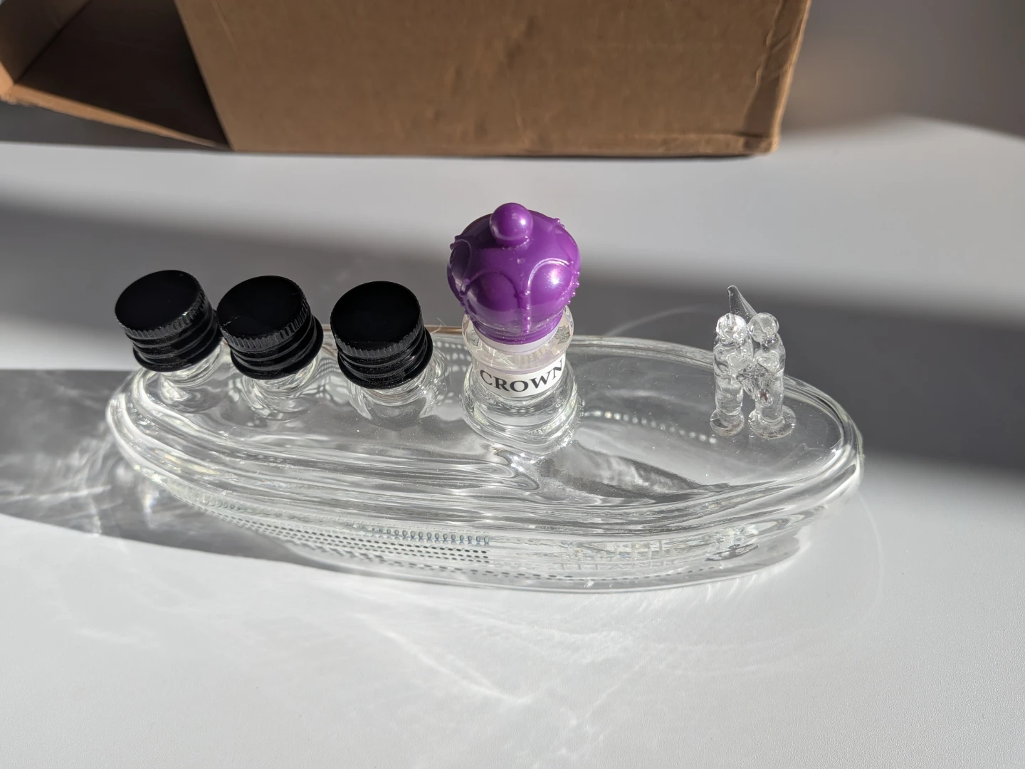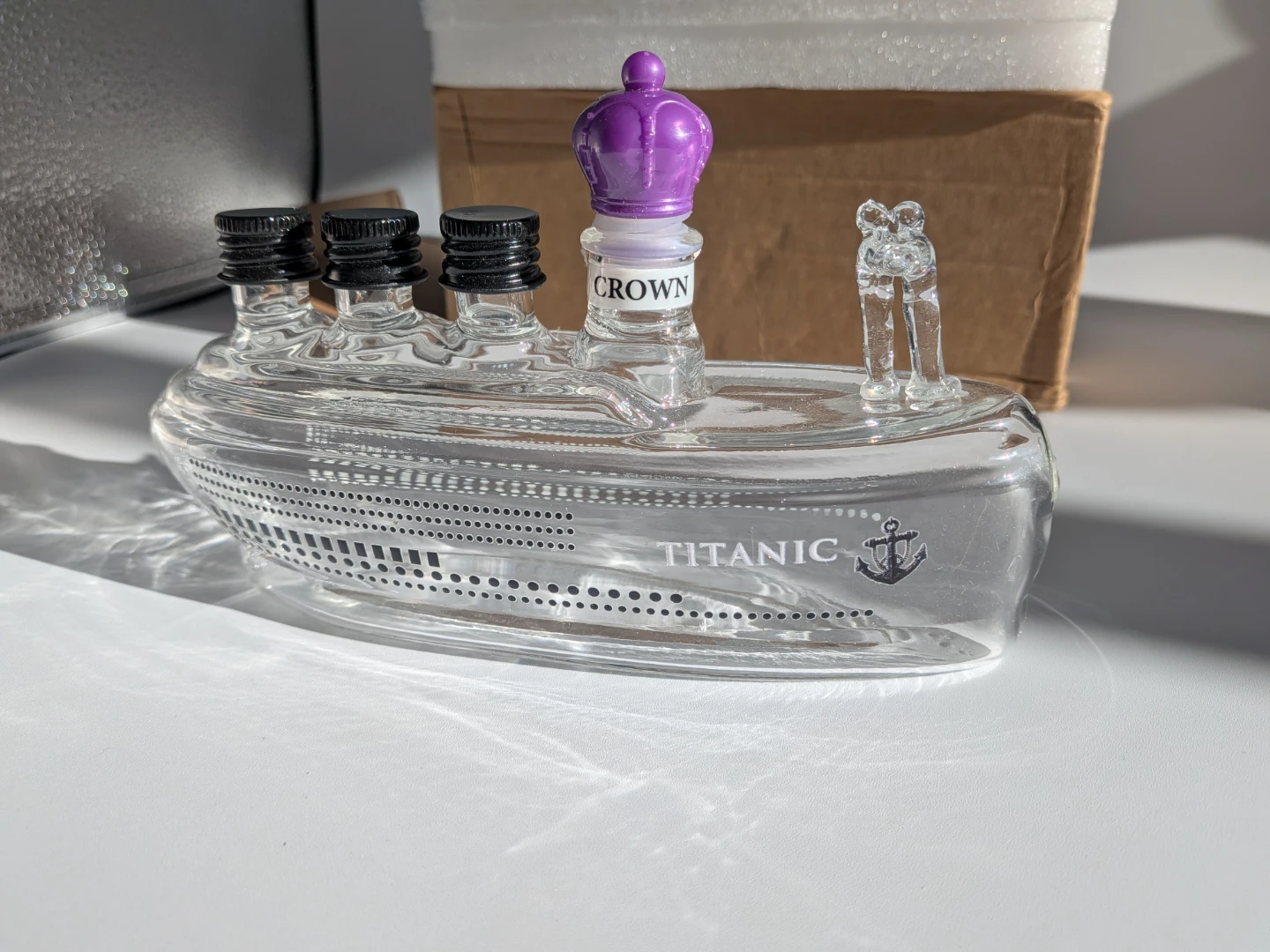 A decorative glass bottle shaped like the Titanic ship. It features a purple crown stopper and a glass figure at the stern. The bottle has four small openings at the front, and the ship's name "TITANIC" is visible on the side. It's approximately 8 inches long.