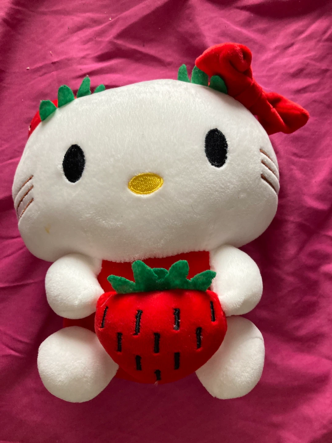 White Hello Kitty plush with a red strawberry accessory. Soft and cuddly. Great for any fan!