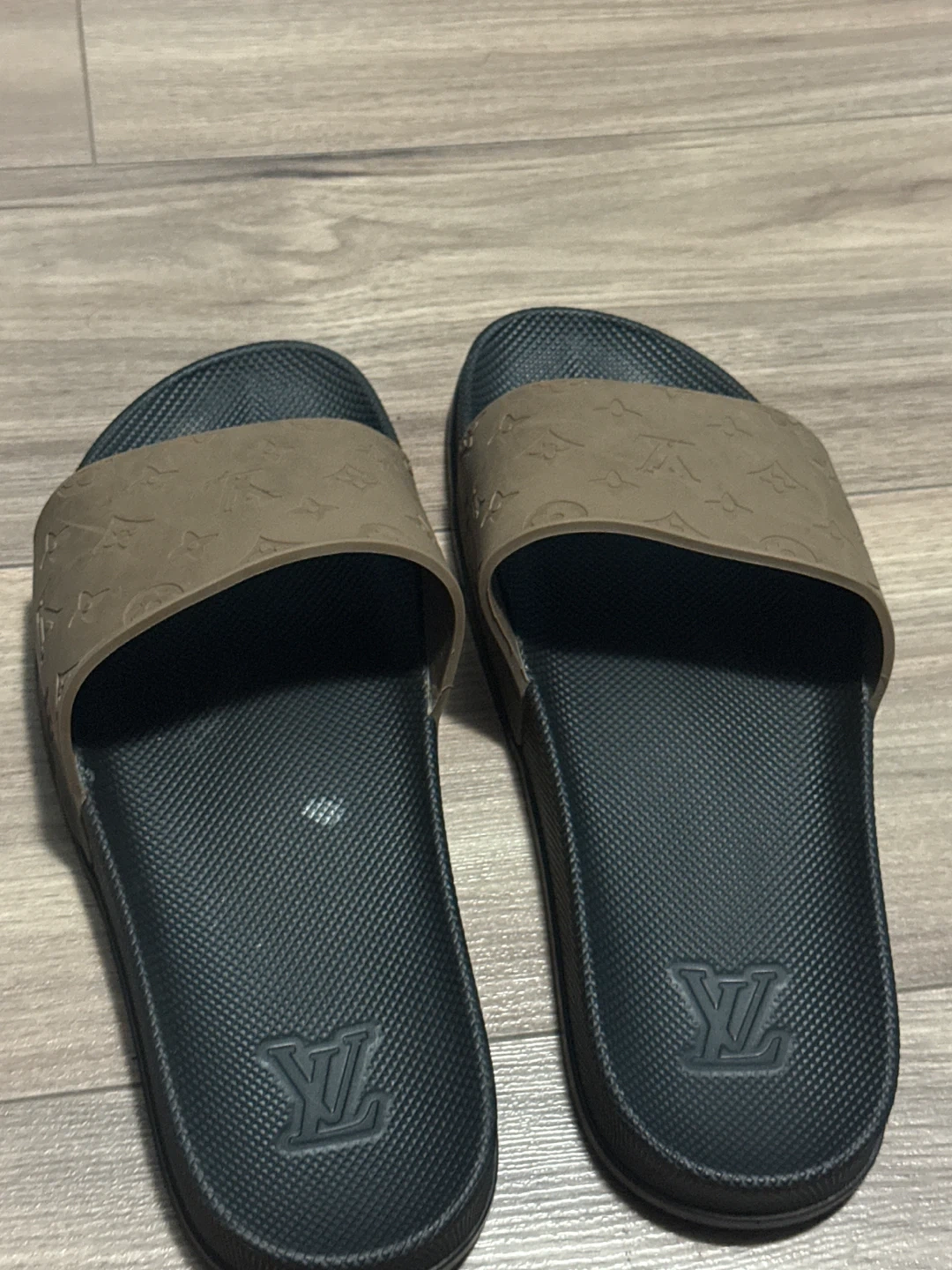 These Louis Vuitton slides feature the classic monogram pattern. They're a stylish and comfortable option for casual wear. The base is black with a tan strap.
