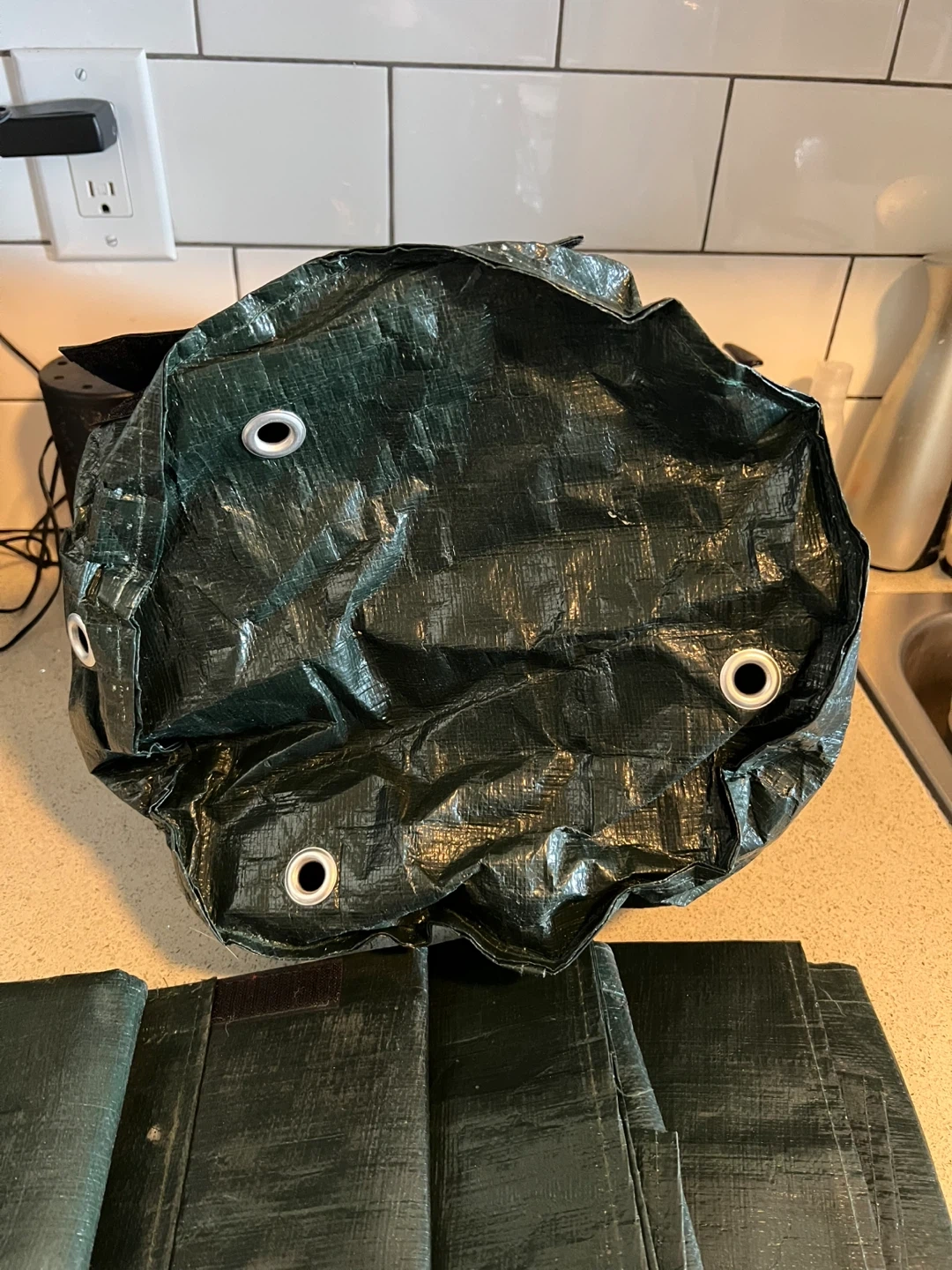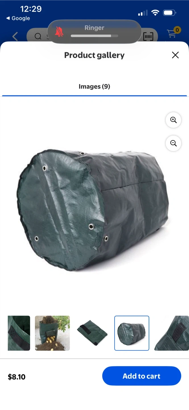 This is a sturdy green grow bag planter. It's made of durable material and features reinforced handles. It's great for growing potatoes or other vegetables. It measures 35cm wide and 50cm tall.