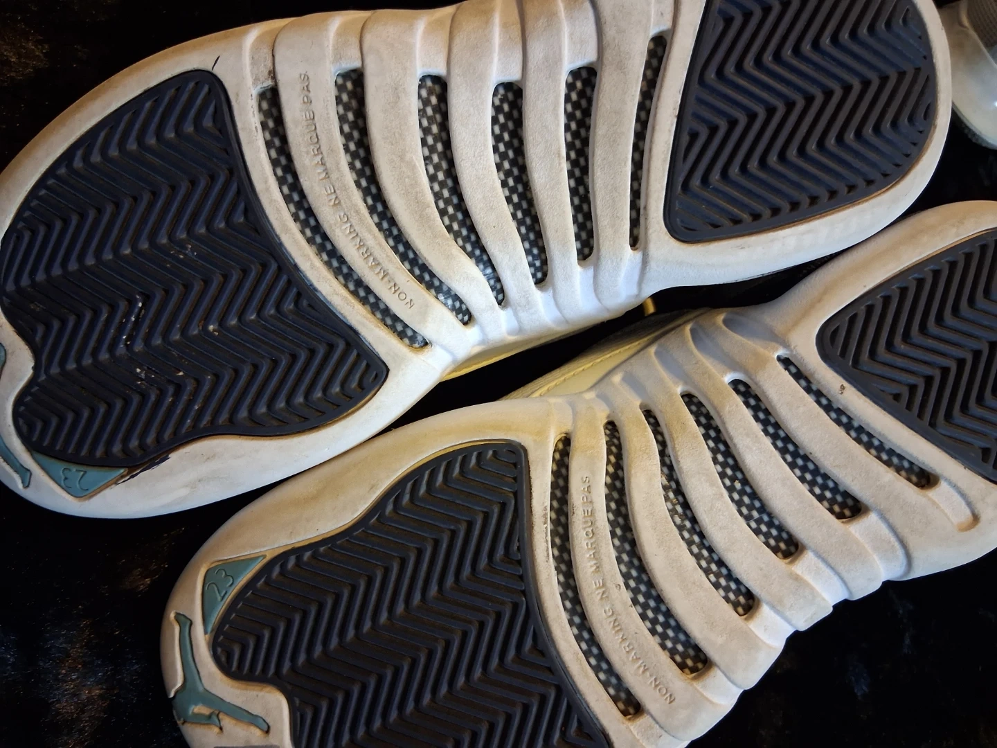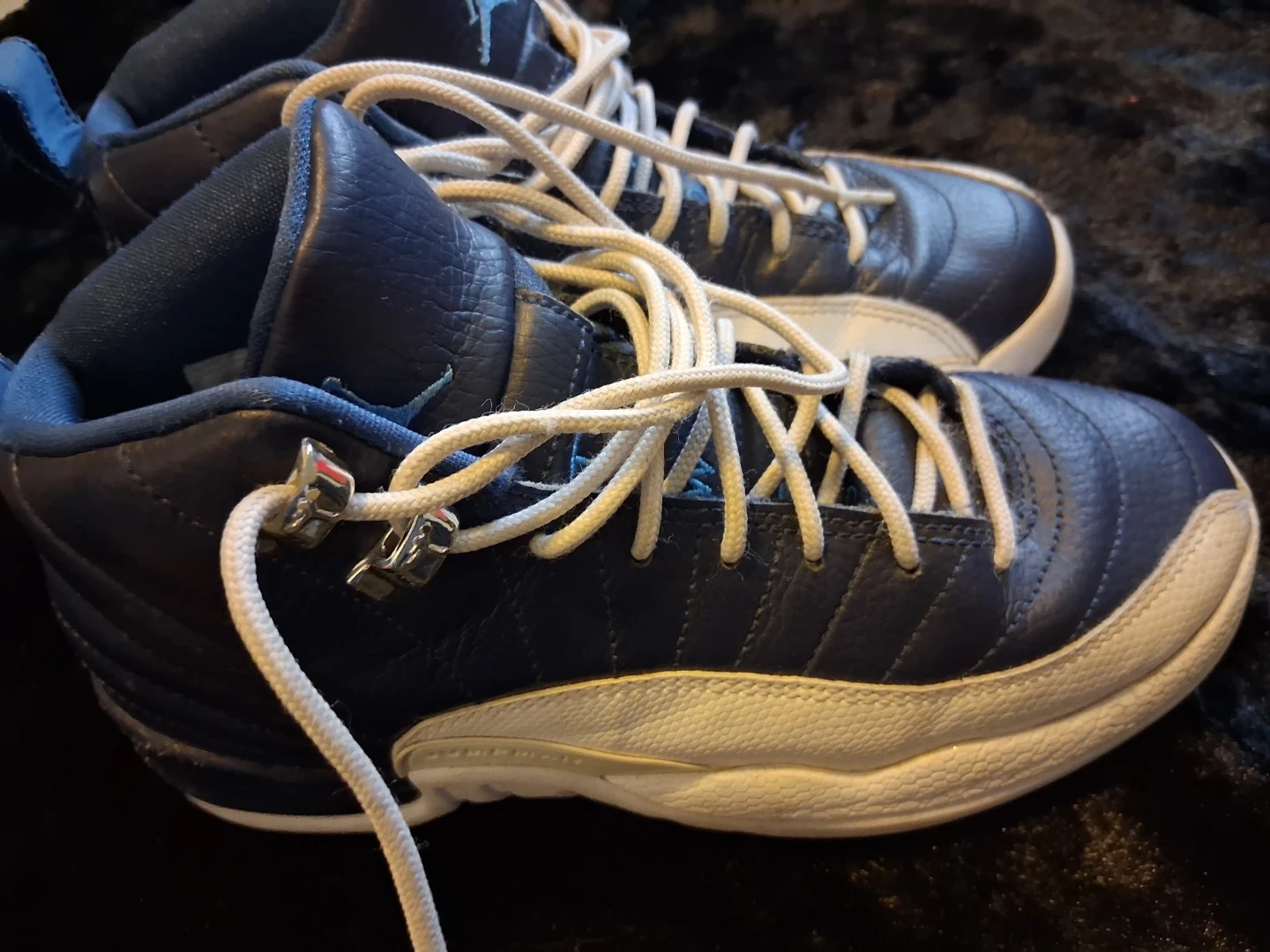 This is a pair of Air Jordan 12 sneakers in a deep royal blue and white colorway. It features the "Jumpman" logo and "23" on the heel. These are a classic basketball shoe.