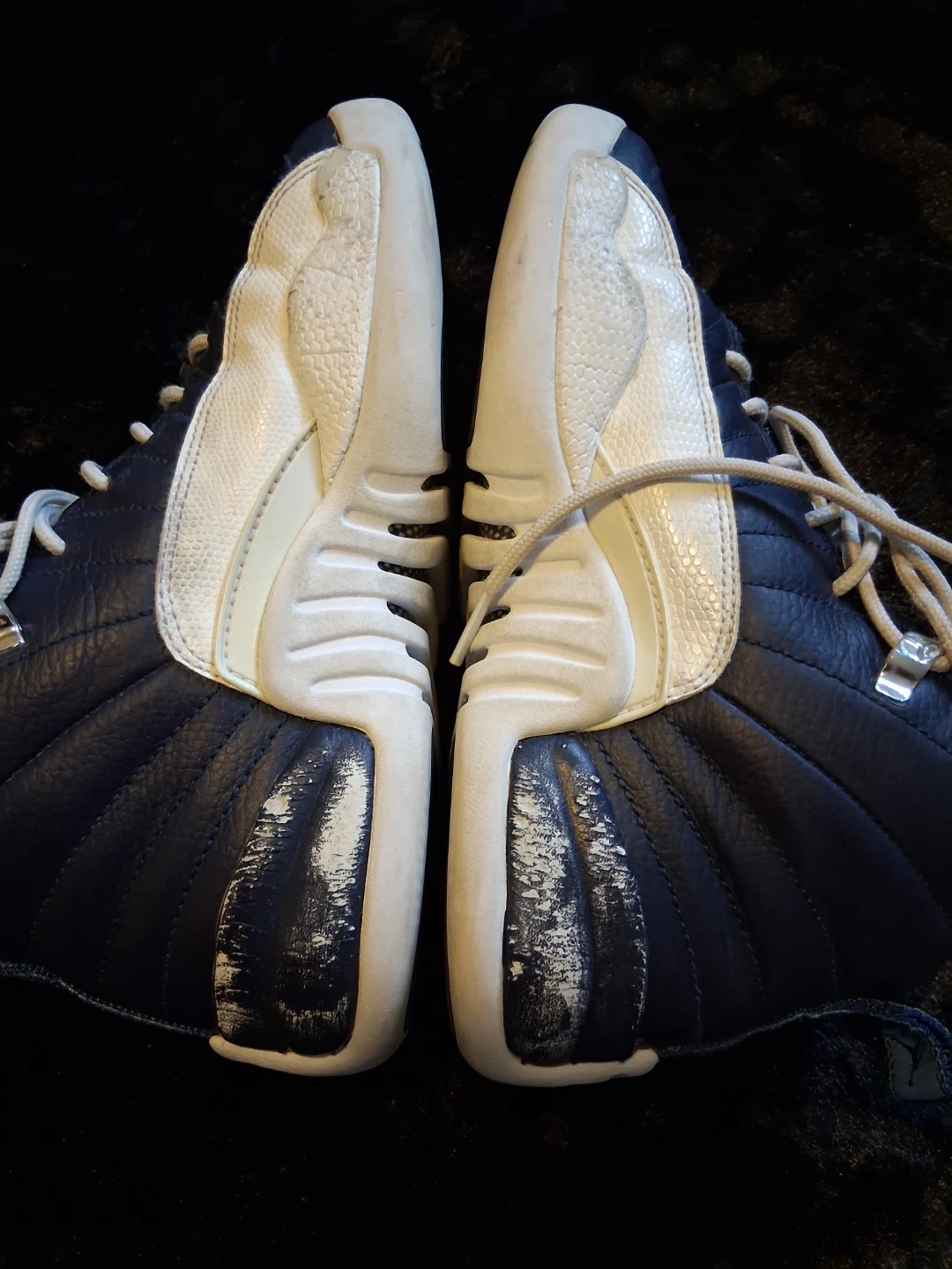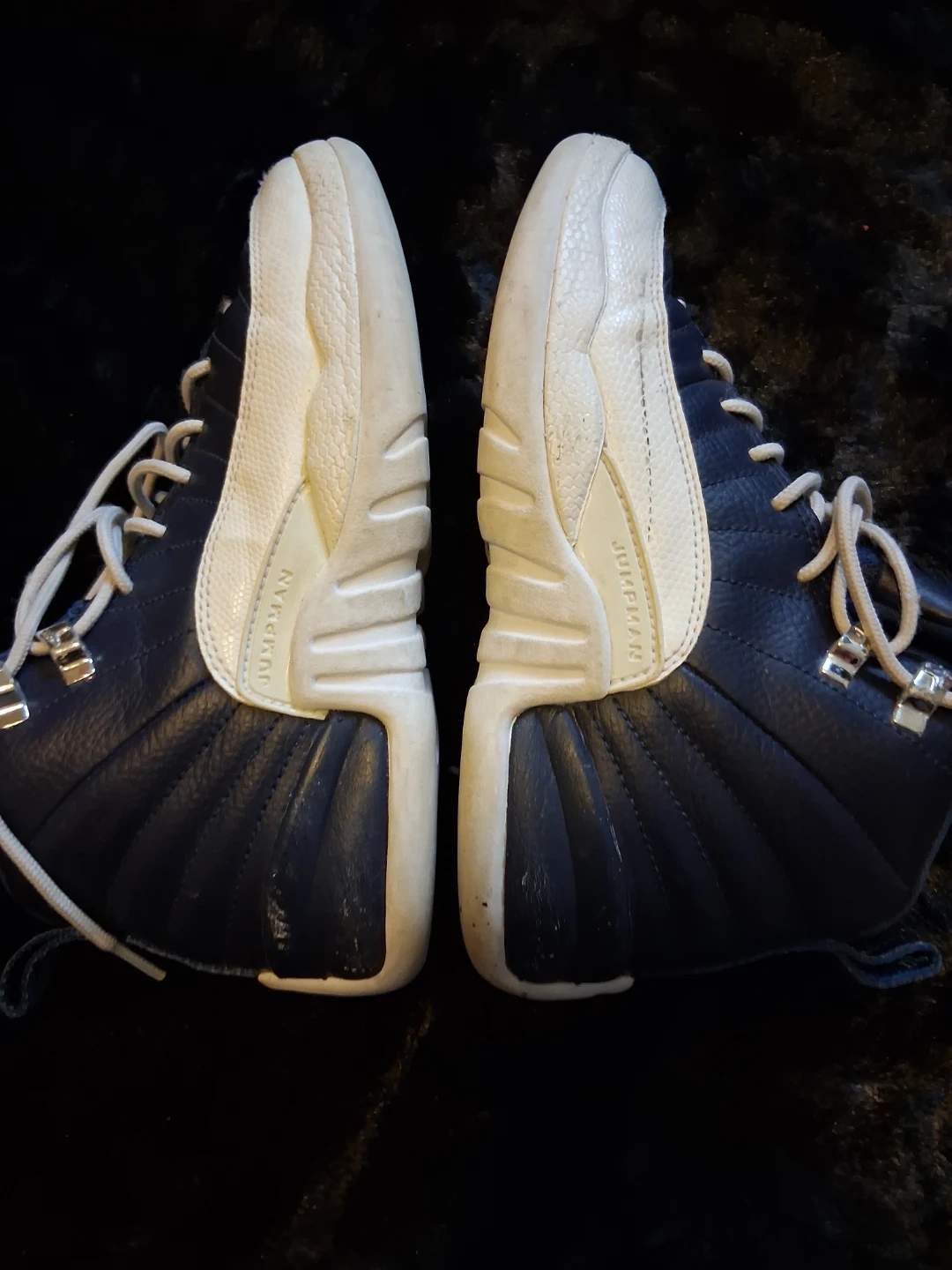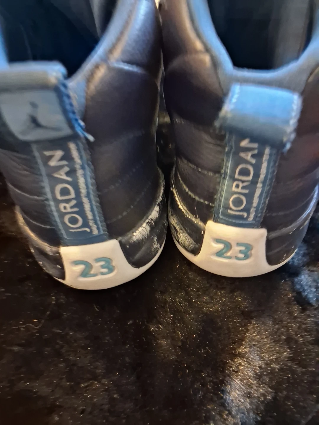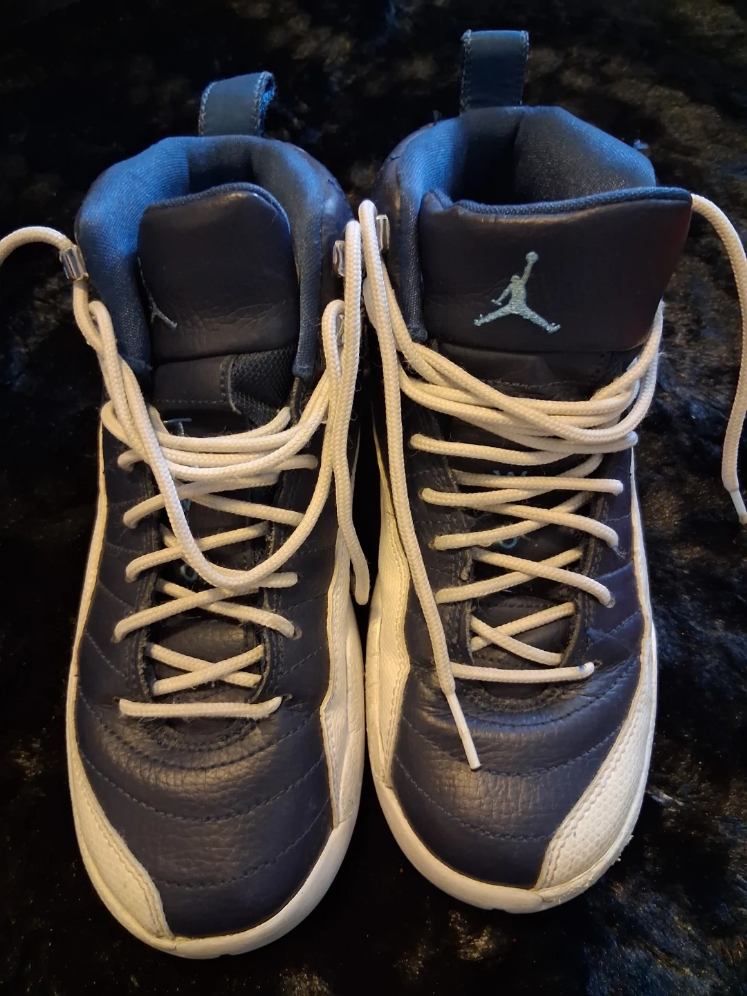 This is a pair of Air Jordan 12 sneakers in a deep royal blue and white colorway. It features the "Jumpman" logo and "23" on the heel. These are a classic basketball shoe.