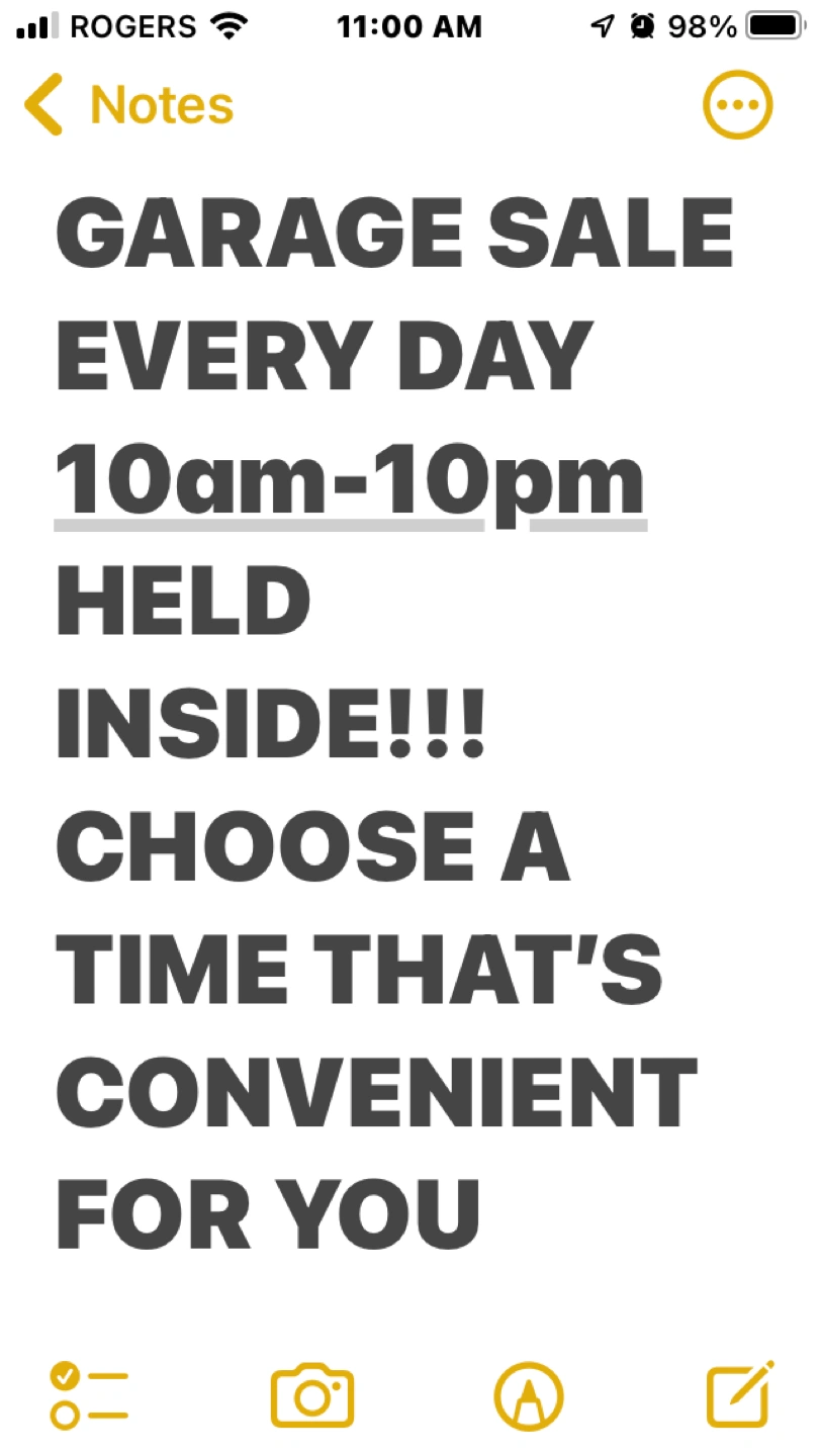Tons of stuff everyday garage sale held inside my garage, electronics, books, Xbox games, music cds, bbq’s, clothing, toys, backpacks, vinyl records 33rpm and 45rpms, Xmas decorations, Valentine’s Day decorations, leaf blower, dvd player, vcr, shoes, movies, tools, and much much more!!!! Choose a day and time that’s convenient for you 10am-10pm 7 days a week!!! 4311 Kingston Rd unit 23 third door on your left hope to see you soon message me for a day and time you’ll arrive. Thanks. Sandy $1 and up
