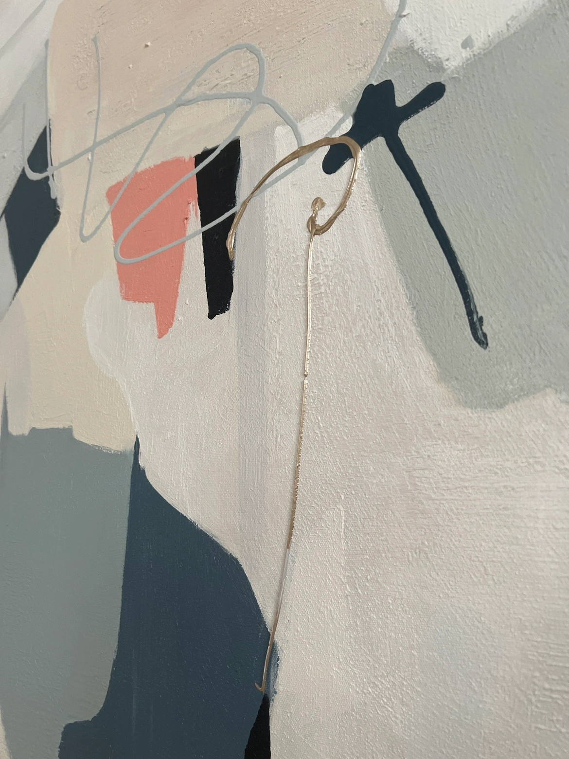 Add a touch of modern art to your space with this abstract print. It features a palette of blues, greys, and a hint of blush pink. The canvas is framed and ready to hang, bringing a contemporary feel to any room.