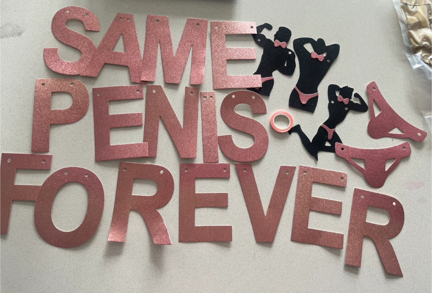 Get ready to celebrate with this playful banner, perfect for a bachelorette party or bridal shower! This banner includes glittery rose gold letters and black silhouette cutouts, adding a cheeky touch to your party decorations. It's in good condition and ready to bring some fun to your event.