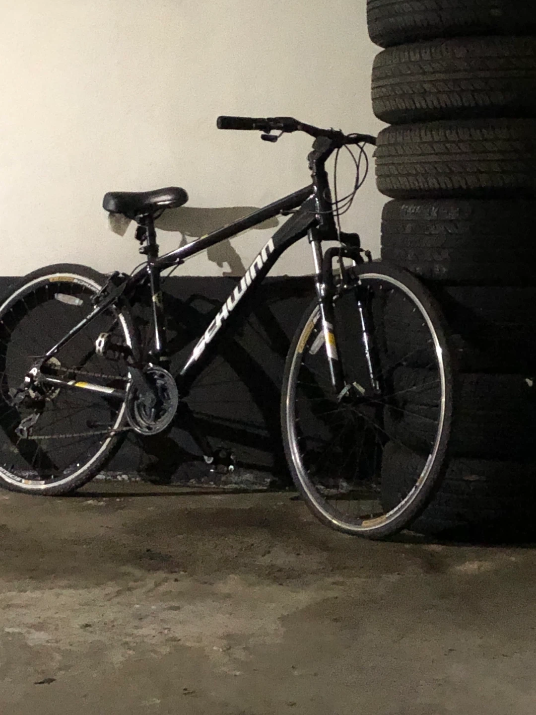 This is a black Schwinn hybrid bicycle. It's a sturdy bike with front suspension. Perfect for commuting or casual rides!